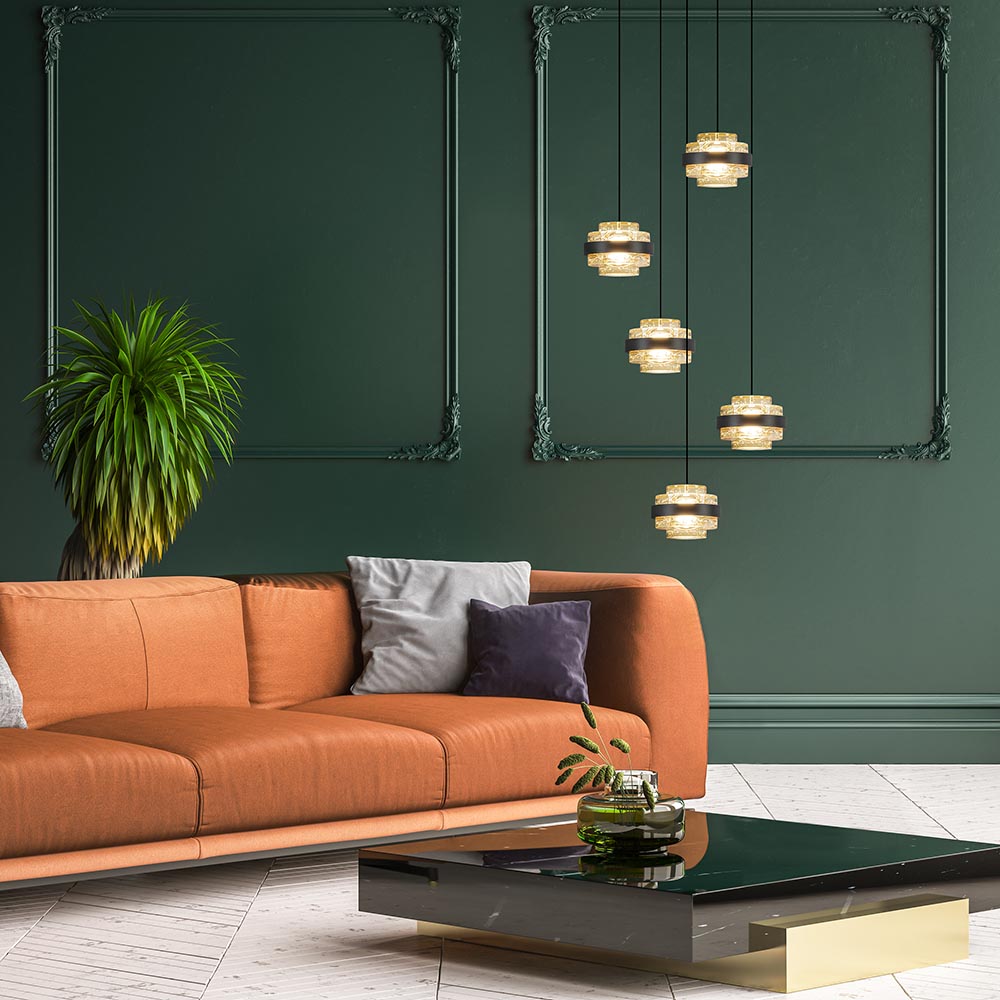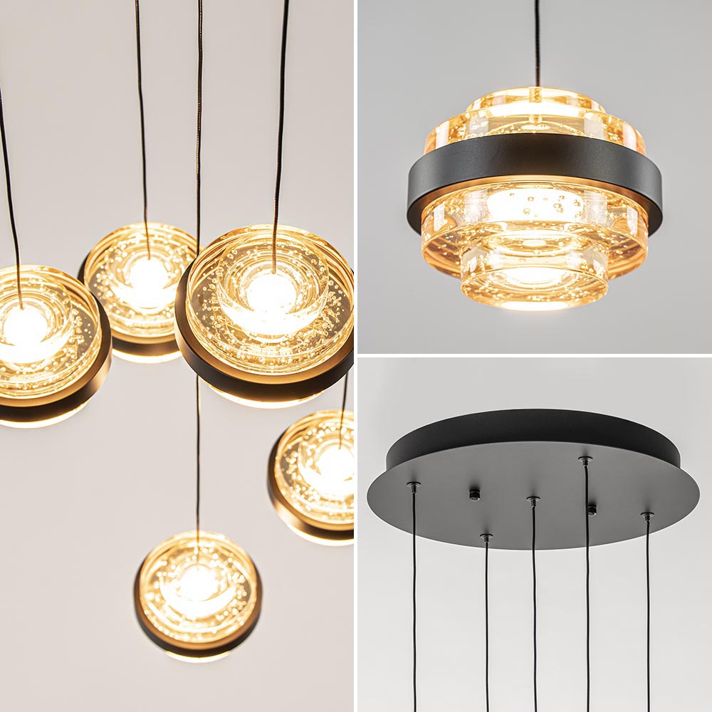 Een sfeervolle toevoeging voor boven een ronde eettafel of salontafel. De kappen hebben een aparte vorm en zijn voorzien van LED verlichting. De kappen zijn deels van massief glas en deels mat zwart metaal. Dit geeft de lamp een luxe uitstraling. Het glas is voorzien van luchtbelletjes wat de hanglamp een speels effect geeft. De hanglamp is gemakkelijk in hoogte aan te passen.