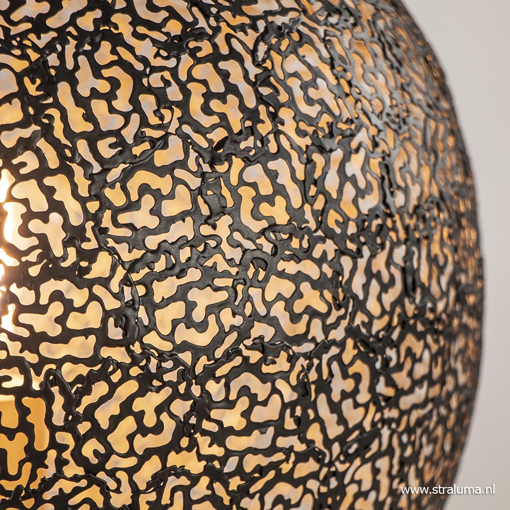 Stoer met een chique uitstraling. Deze moderne tafellamp doet een beetje denken aan koraal en is gemaakt uit kleine metaaldeeltjes die samen de ronde kap vormen. Het metaal is afgewerkt met een mat zwarte finish aan de buitenzijde en een gouden finish aan de binnenzijde. Het goud zorgt voor een luxe chique uitstraling en creëert tevens een sfeervolle warme gloed. Ook de fitting is afgewerkt in de kleur goud. De zwart gouden bol is bevestigd op een ronde metalen voet en heeft een zwart snoer van 155 cm, waarbij de schakelaar op 35 cm van de lamp zit. De kap is los te maken door de drie klepjes iets naar binnen te buigen. De moderne tafellamp wordt geleverd zonder lichtbron (E27).