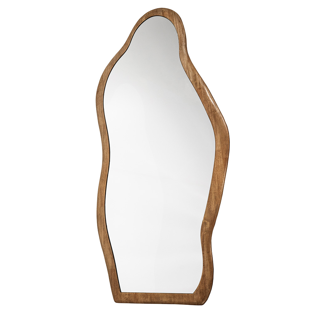 De “Outline” spiegel combineert een speelse, organische vorm met warme houttinten, en serveert zowel als functioneel spiegelfront als stijlvol designobject.