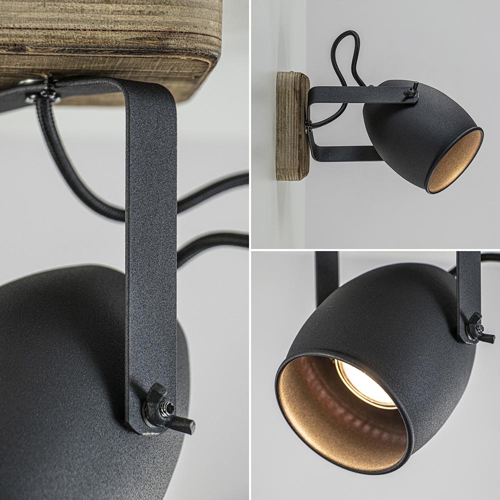 – hoogte: 20 cm – kap: Ø9×11,5 cm – bevestiging: 11x11x2,5 cm – metaal, mat zwart – hout – verstelbaar – exclusief lichtbron (GU10) – dimbaar (exclusief)