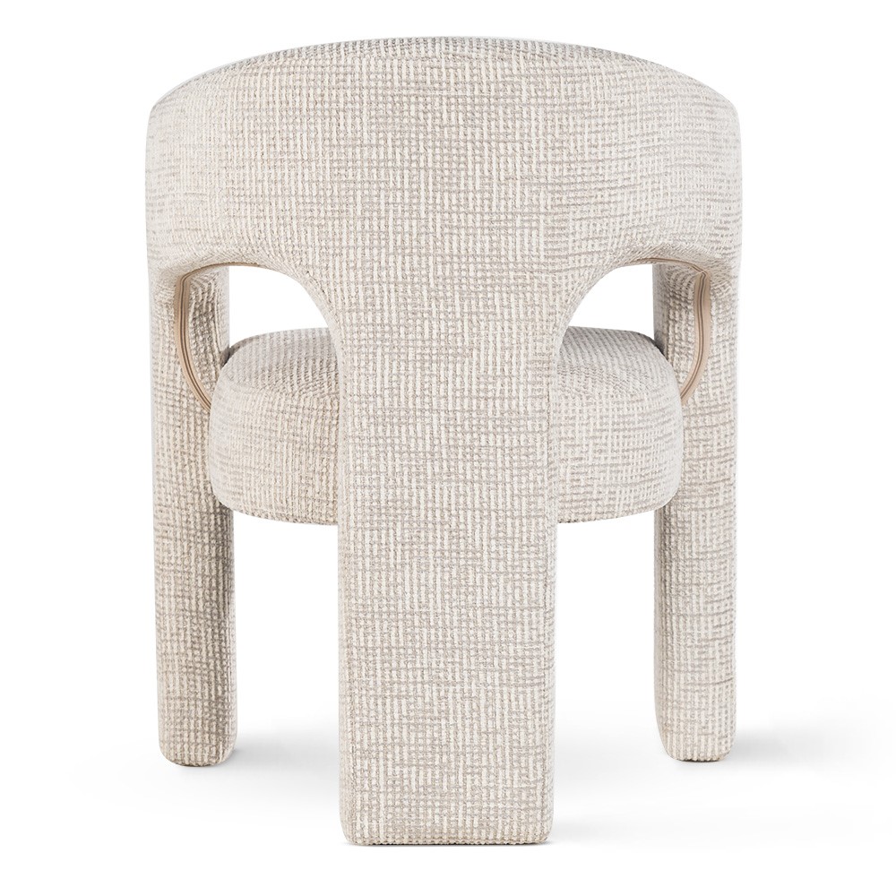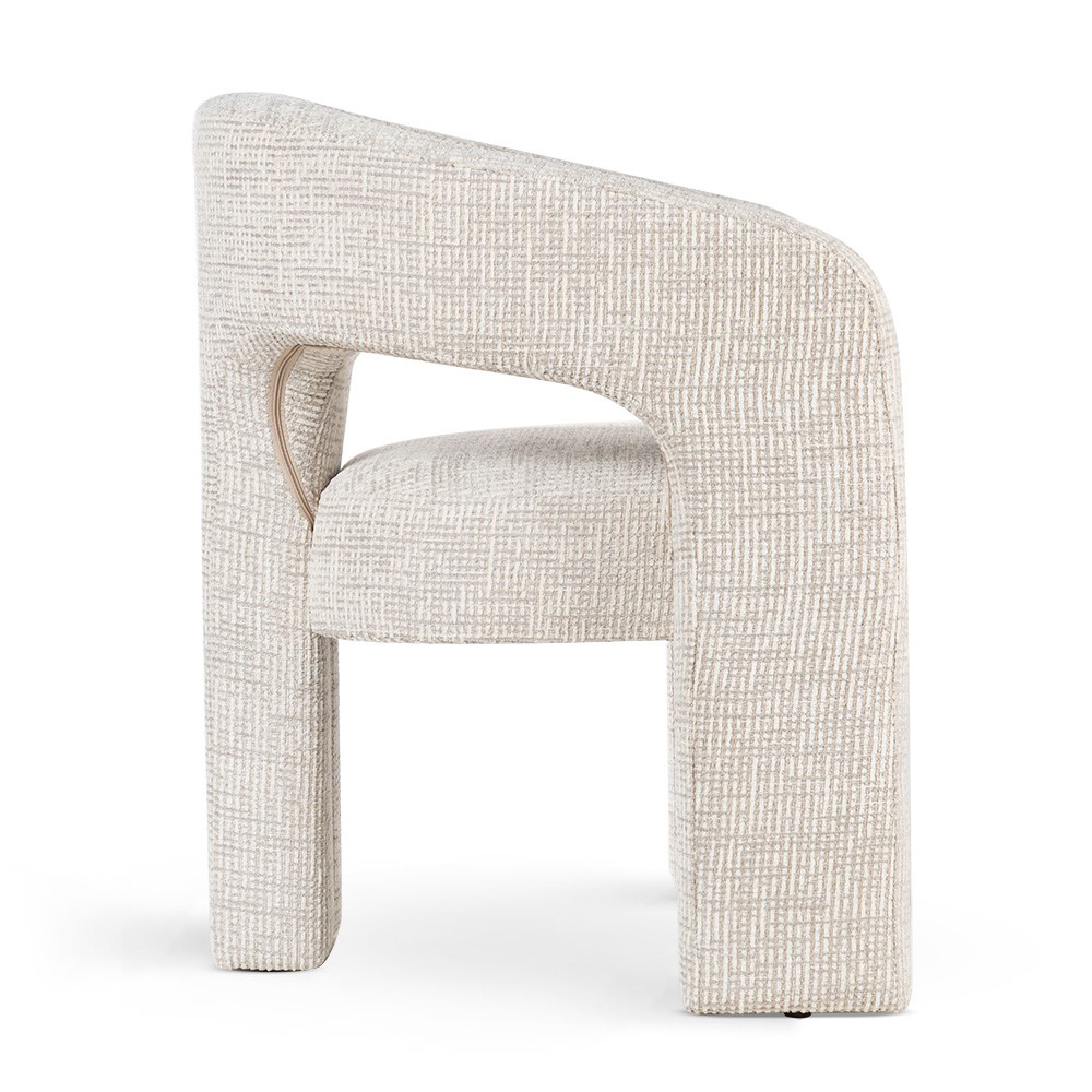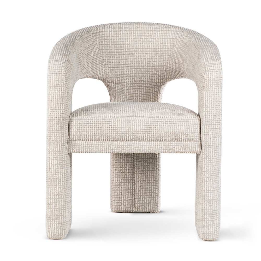 Maak kennis met Macao: een opvallende designstoel die comfort en kunstzinnigheid perfect combineert. Met zijn afgeronde vormen, robuuste stoffering en speelse openingen in de rugleuning, straalt deze stoel een eigentijdse en sculpturale charme uit. De zachte zandkleurige bekleding met grafisch geweven patroon voelt rijk en warm aan, terwijl de volledig gestoffeerde poten en armleuningen het geheel een luxe uitstraling geven. Door het compacte formaat is Macao ideaal als blikvanger in de woonkamer, slaapkamer of hal.