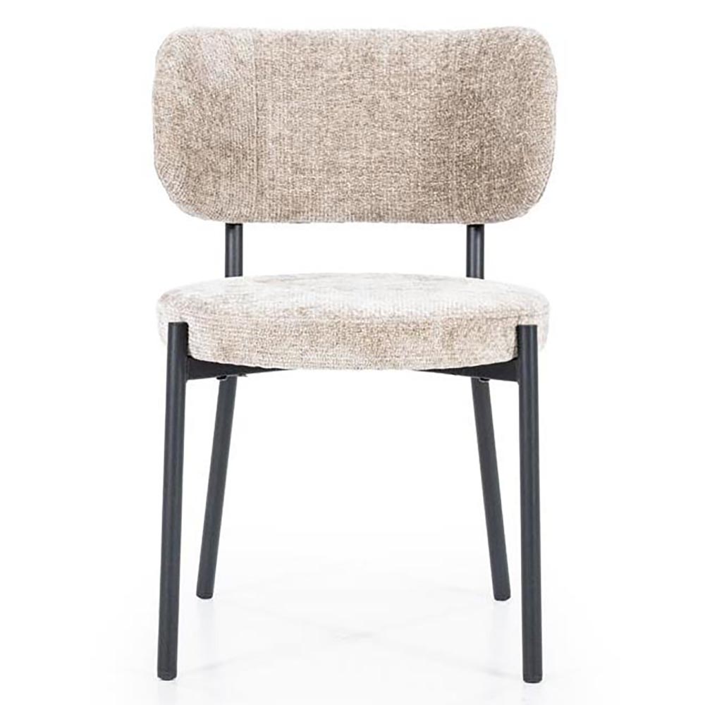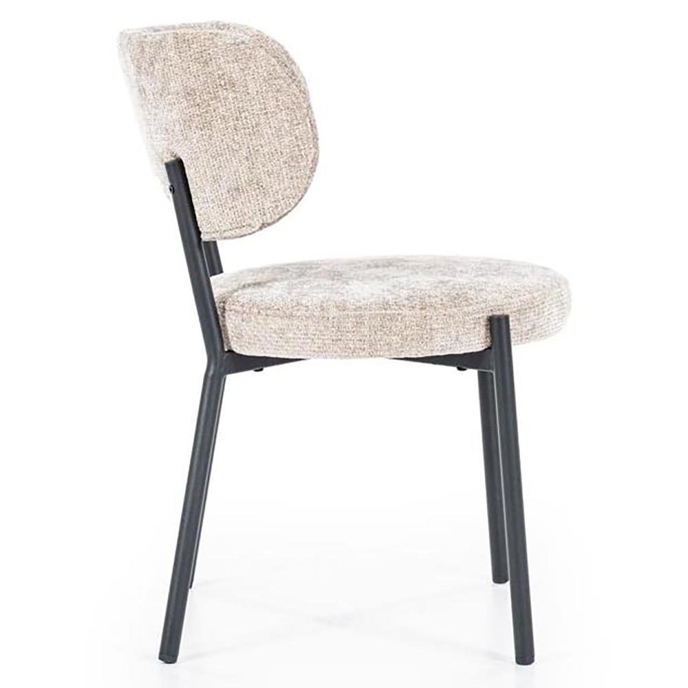 Korte omschrijving De “Oasis” is een moderne eetkamerstoel met een comfortabele, licht afgeronde rugleuning en een zachte stoffering in warme taupetint. Het zwart metalen frame zorgt voor een eigentijdse en stabiele basis.