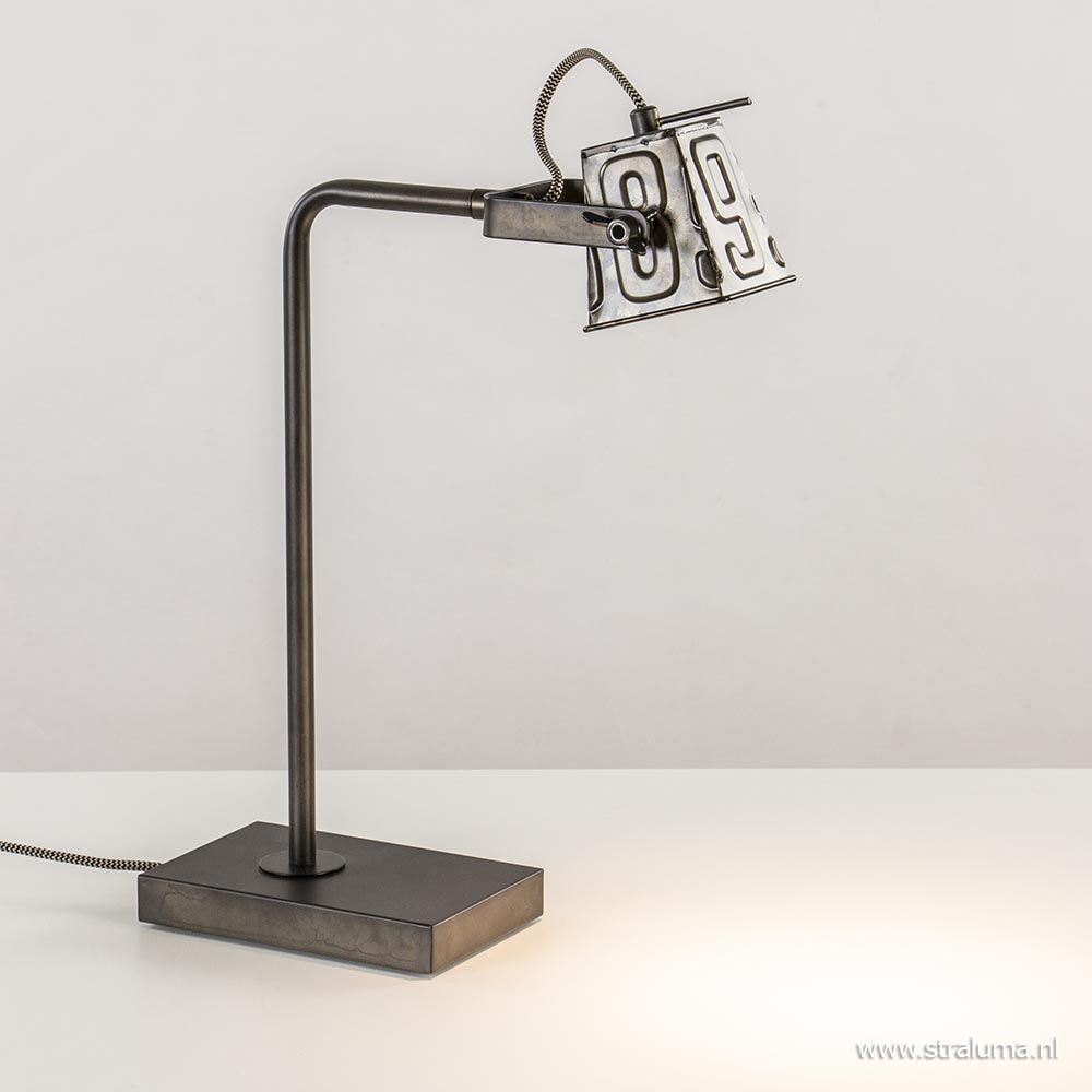 Een ideale lamp voor op uw bureau, dressoir of nachtkastje. Deze metalen tafellamp is van meerdere markten thuis. De industriele lamp kan prima dienen als sfeerverlichting maar ook als functionele verlichting op uw bureau. Het fijne aan de lamp is dat de kap is te draaien en te kantelen zodat u deze gemakkelijk en snel naar de juiste richting kunt katen schijnen. Handig wanneer u aan uw bureau aan het werk bent of in bed een boek wilt lezen. Het metalen kapje met cijfers geeft een extra robuuste look en doet denken aan de industriele loodsen en fabrieken. De metalen tafellamp is voorzien van een zwart/bruin strijkijzersnoer van 145 cm met een schakelaar op 25 cm van de lamp en wordt exclusief lichtbron (GU10) geleverd.