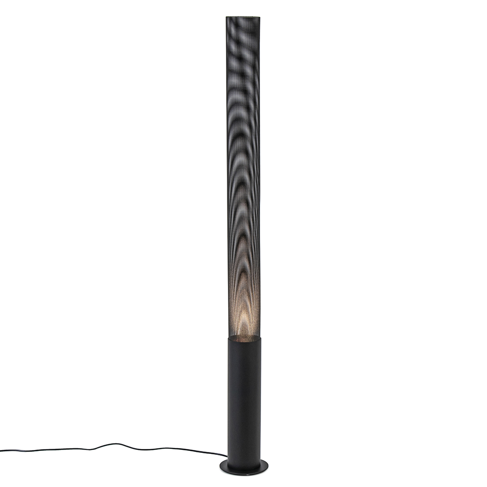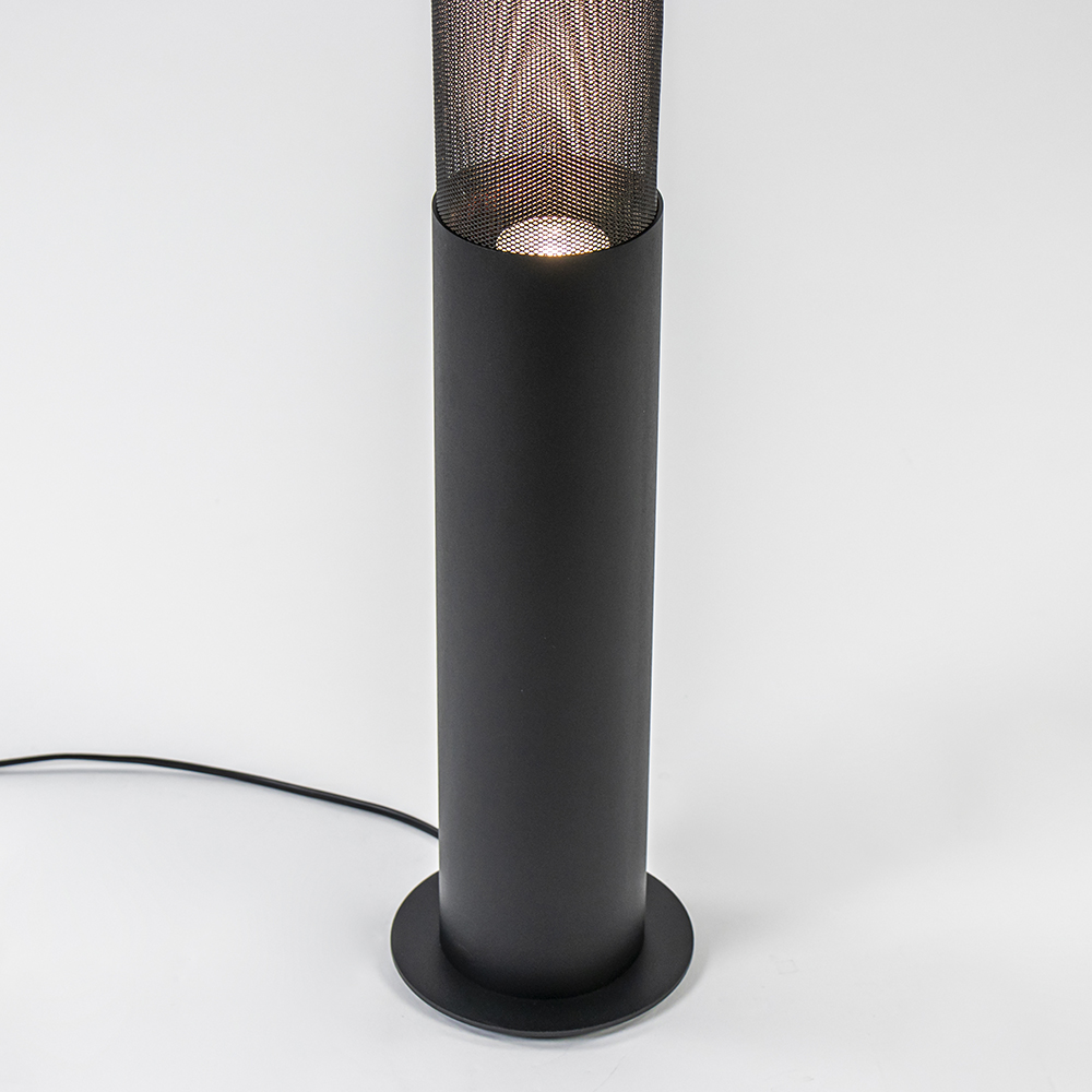 Deze stoere vloerlamp is een mooie aanvulling op een donkere hoek of naast de bank. De cilinder vloerlamp bestaat uit een zwarte voet met daarop een gaas kap. Deze zorgt ervoor dat het licht kan verspreiden door de kleine gaatjes. De kap wordt vanuit de voet uitgelicht door een GU10 spot. De cilinder vloerlamp wordt bediend dmv de schakelaar in het snoer. Deze bevindt zich op 150 cm van de lamp en het snoer heeft een totale lengte van 300 cm. De stoere mat zwarte vloerlamp wordt geleverd zonder lichtbron.