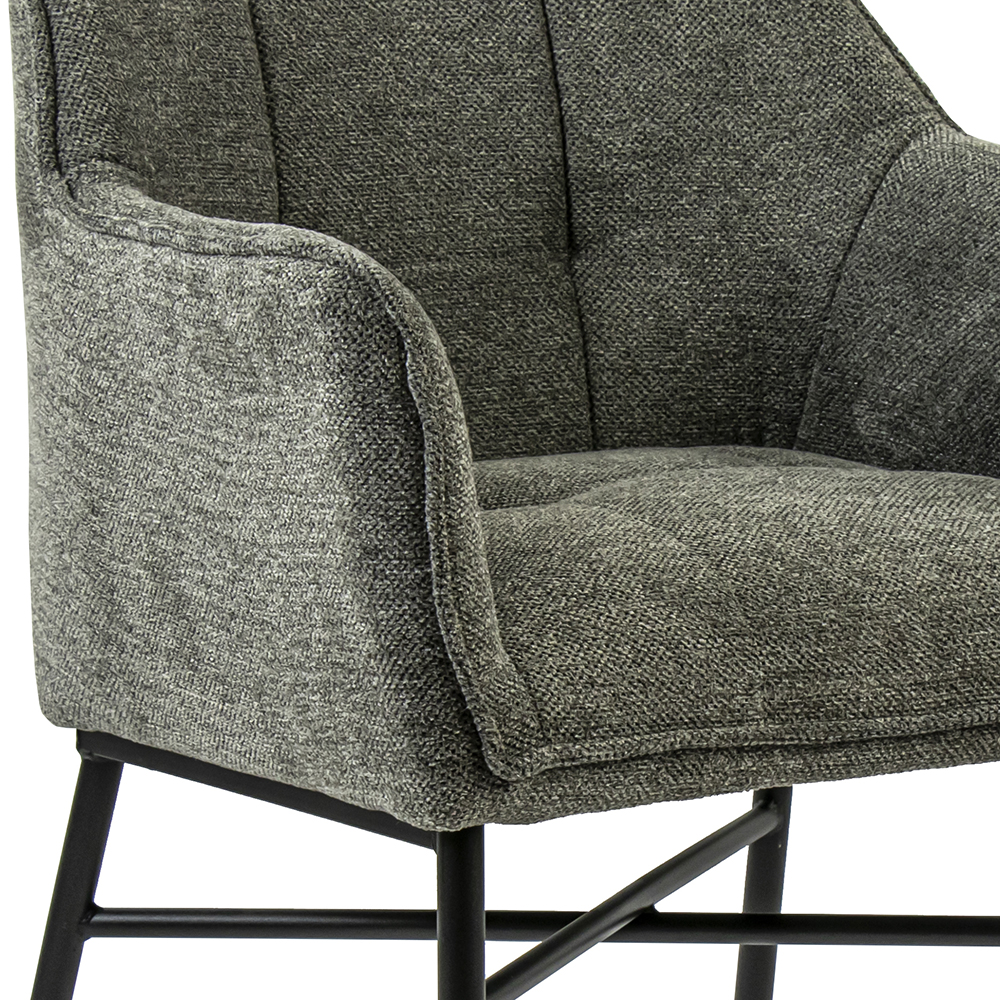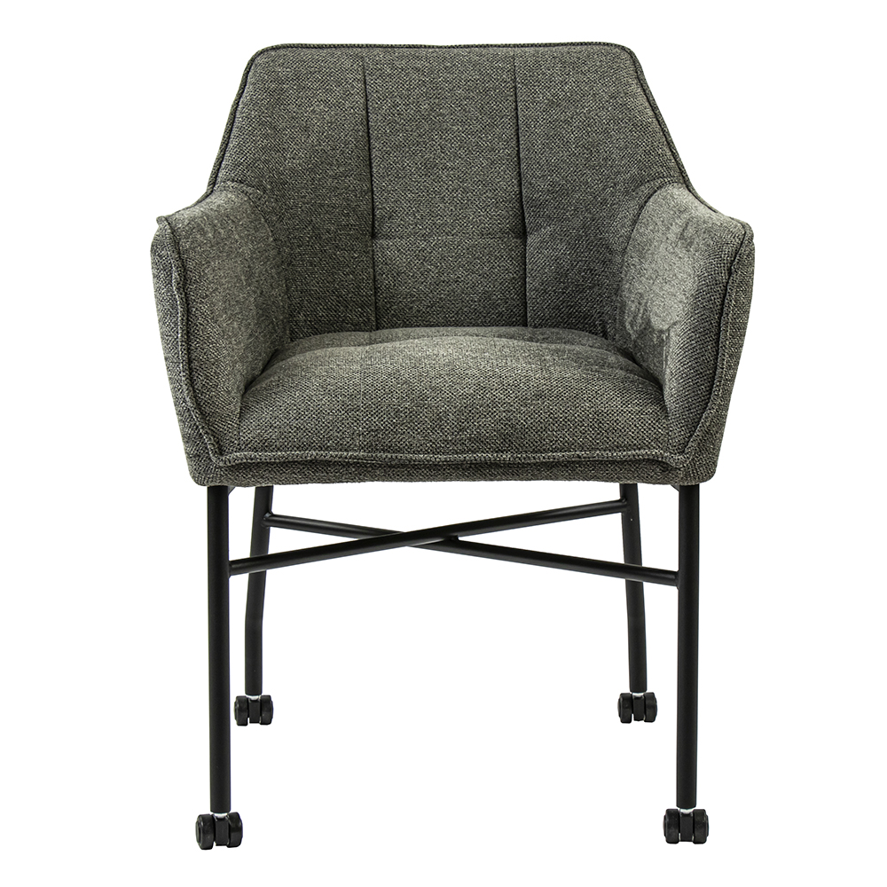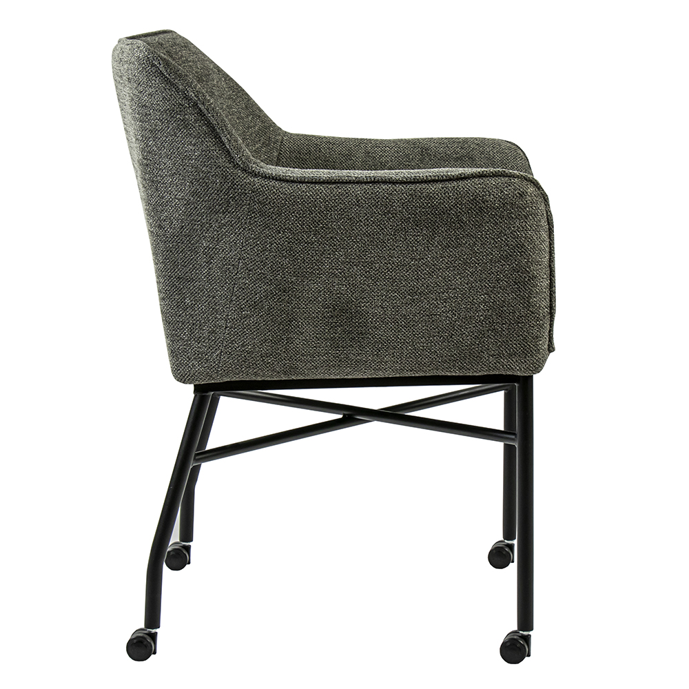 Een heerlijke comfotabele eetkamerstoel op wieltjes. De armstoel maakt dineren nog fijner en zorgt dat aanschuiven nog gemakkelijker gaat dankzij de wieltjes. De eetkamerstoel heeft een zachte stoffen zitting met een grove strcutuur en is uitgevoerd in het grijs. Het frame dat de zitting ondersteund is van metaal en voorzien van een mat zwart finish.