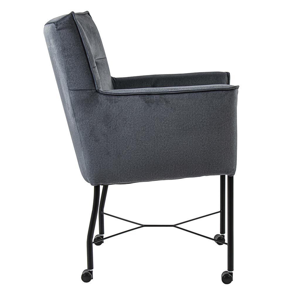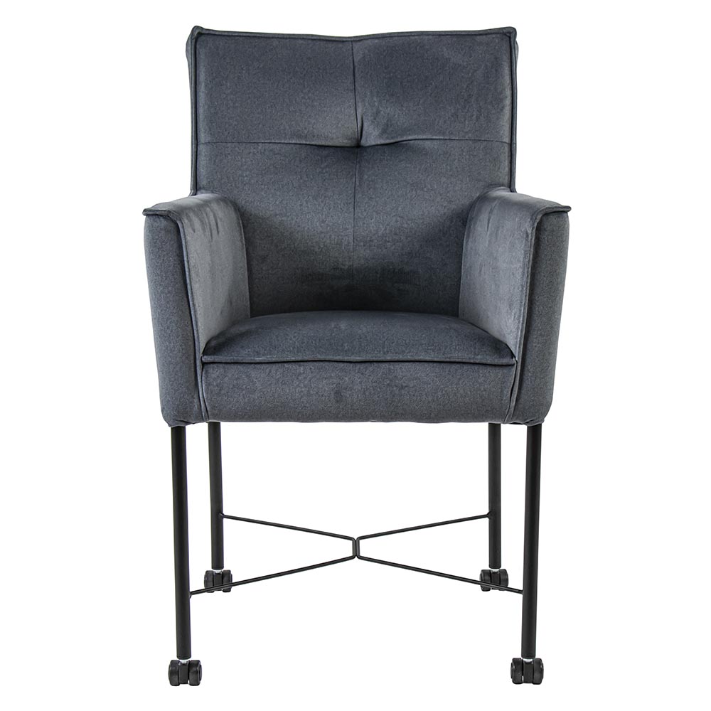 Deze eetkamerstoel is voorzien van een fijne zachte stof in het grijs/blauw. Dit geeft een fijn zitcomfort dat mede door de armleuning wordt vergroot. Ideaal om heerlijk in te tafelen of borrelen. De armstoel heeft een hoge rugleuning en een metalen poot in het mat zwart. Voor extra gemak staat de stoel op zwarte wieltjes.