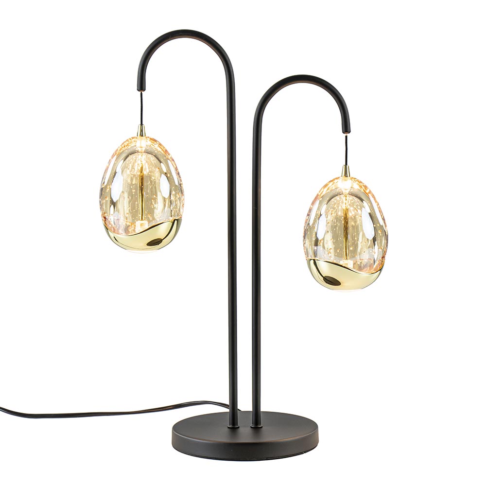 Een sfeervolle toevoeging voor op een dressoir, bijzettafel of zelfs het nachtkastje. De 2 kapjes zijn gevormd als een ei en voorzien van LED verlichting. De kapjes zijn deels van massief glas en deels goudkleurig metaal op een mat zwart frame. Dit geeft de tafellamp een luxe en stoere uitstraling. Het glas is voorzien van luchtbelletjes wat de tafellamp een speels effect geeft. De verlichting geeft direct licht naar beneden door middel van de spot onderop het ei, en daarnaast ook indirect licht doordat het ei van binnenuit verlicht wordt. Dit tafellampje is gemakkelijk te dimmen met de bijgeleverde dimmer. De dimmer van de lamp bevindt zicht op 40 CM van het armatuur.