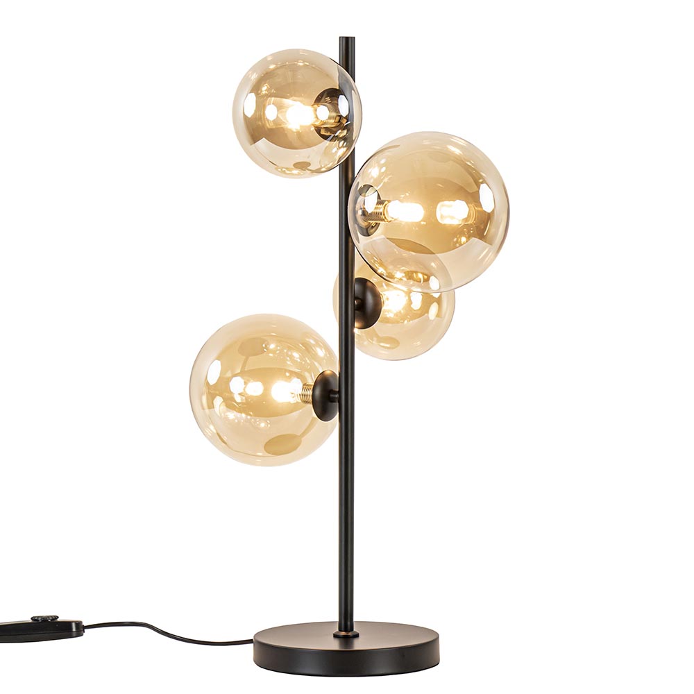 Een chique tafellamp die helemaal past binnen de huidige woontrends, van hotel chic tot art deco. De tafellamp heeft een slank design waardoor de aandacht echt naar het glas gaat. Het amber glas straalt warmte en luxe uit en is zowel aan als uit een plezier voor het oog. De glazen bollen worden met schroefdraad op het mat zwarte armatuur vastgezet en zijn verdeeld over 2 afmetingen, 15 en 12 cm doorsnede. De tafellamp is voorzien van een dimmer in het snoer, welke een lengte heeft van 185 cm. De chique tafellamp wordt geleverd zonder lichtbronnen.