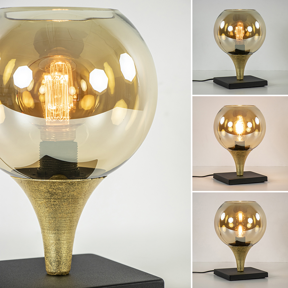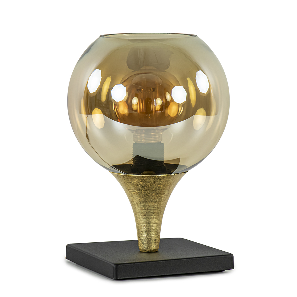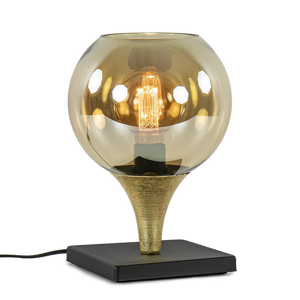 Deze sfeermaker is een mooie toevoeging aan het interieur. De tafellamp heeft een strak klassieke look met een retro knipoog. Het armatuur is uitgevoerd in het zwart met een gouden detail. Dit is mooi gecombineerd met een amber glazen bol die zorgt voor een warme uitstraling. De tafellamp is voorzien van een zwart snoer met een lengte van 120 cm en wordt geleverd exclusief lichtbron. Een ideale toevoeging op een bijzettafel, kast of het nachtkastje.