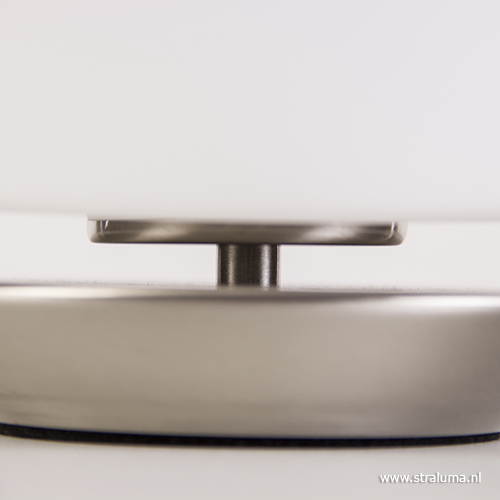 Tafellamp Ancilla LED met een staalkleurige voet en wit glas. Voordeel van deze voet is dat het gelijk een touchdimmer is. De stalen tafellamp gaat aan zodra je de voet aanraakt en kent vier dimstanden. Dit maakt de lamp ideaal voor in de slaapkamer op het nachtkastje, maar is ook prima te combineren in de woonkamer of op het bureau. De tafellamp is voorzien van een LED lichtbron met een G9 fitting. Deze lamp is met een stalen en een bronzen voet verkrijgbaar.