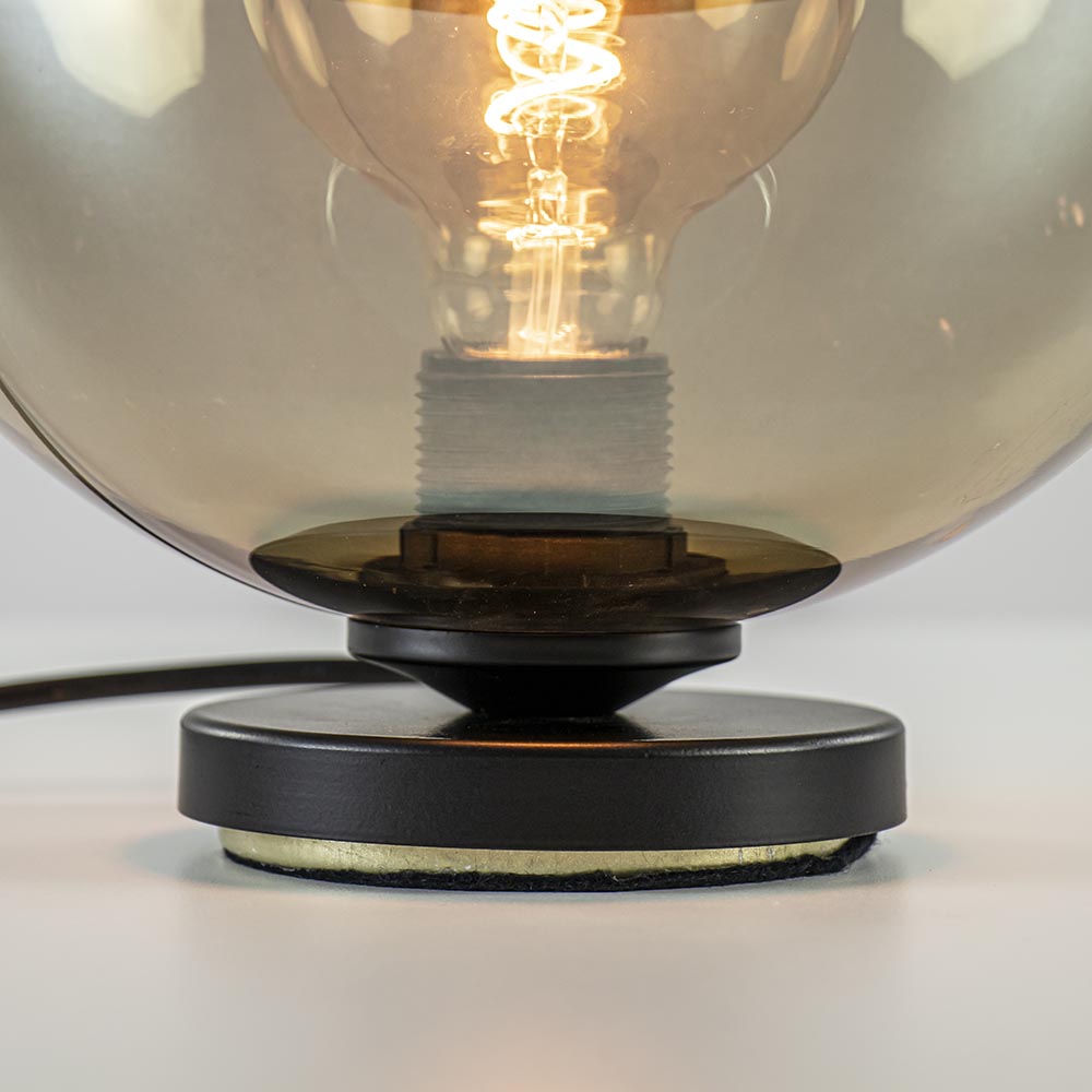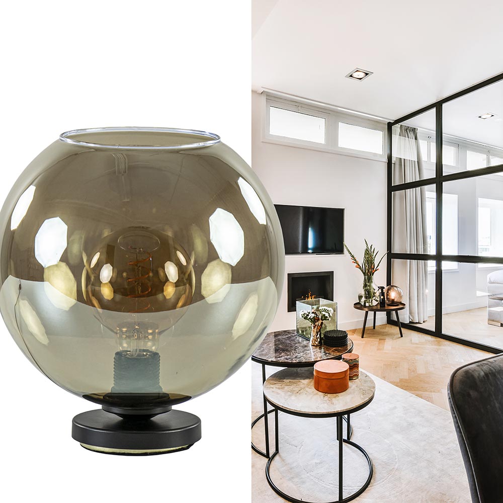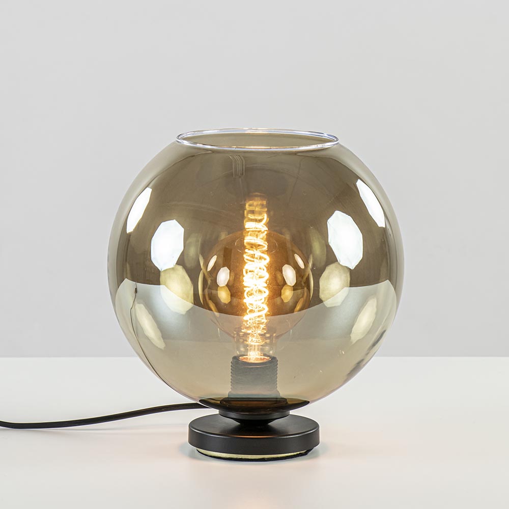 Een sfeervolle tafellamp met een luxe uitstraling. De tafellamp bestaat uit een metalen voet die is uitgevoerd in het mat zwart en een smoke glazen bol met een doorsnede van 25 cm. Het donkere glas geeft een chique luxe uitstraling die mooi is toe te passen in diverse woonstijlen. De tafellamp past perfect op een dressoir, kast of zelfs het nachtkastje. De ronde voet is voorzien van een zwart snoer met een lengte van 180 cm, de knipschakelaar zit op 65 cm in het snoer. De tafellamp smoke glazen bol 25 cm wordt geleverd zonder lichtbron (E27).