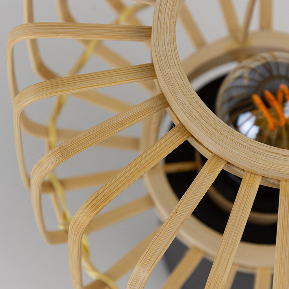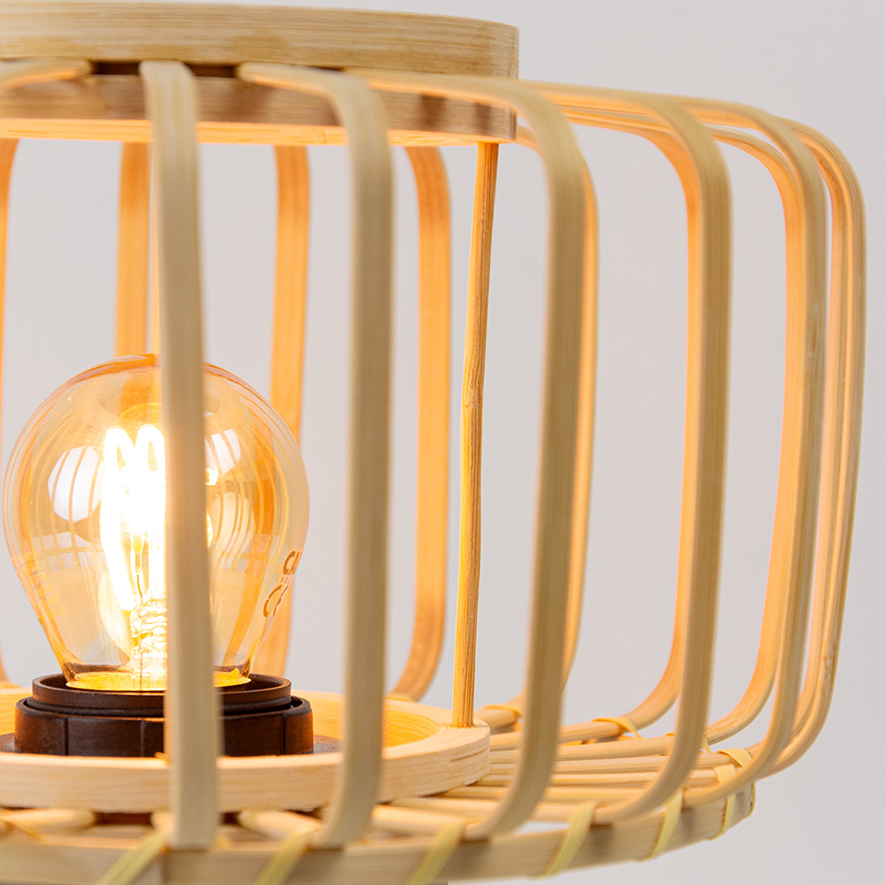De ronde bamboekap zorgt voor een warme, natuurlijke lichtverspreiding en laat het licht mooi door de open structuur spelen. Perfect te combineren met een decoratieve filament lichtbron voor een extra stijlvol effect.