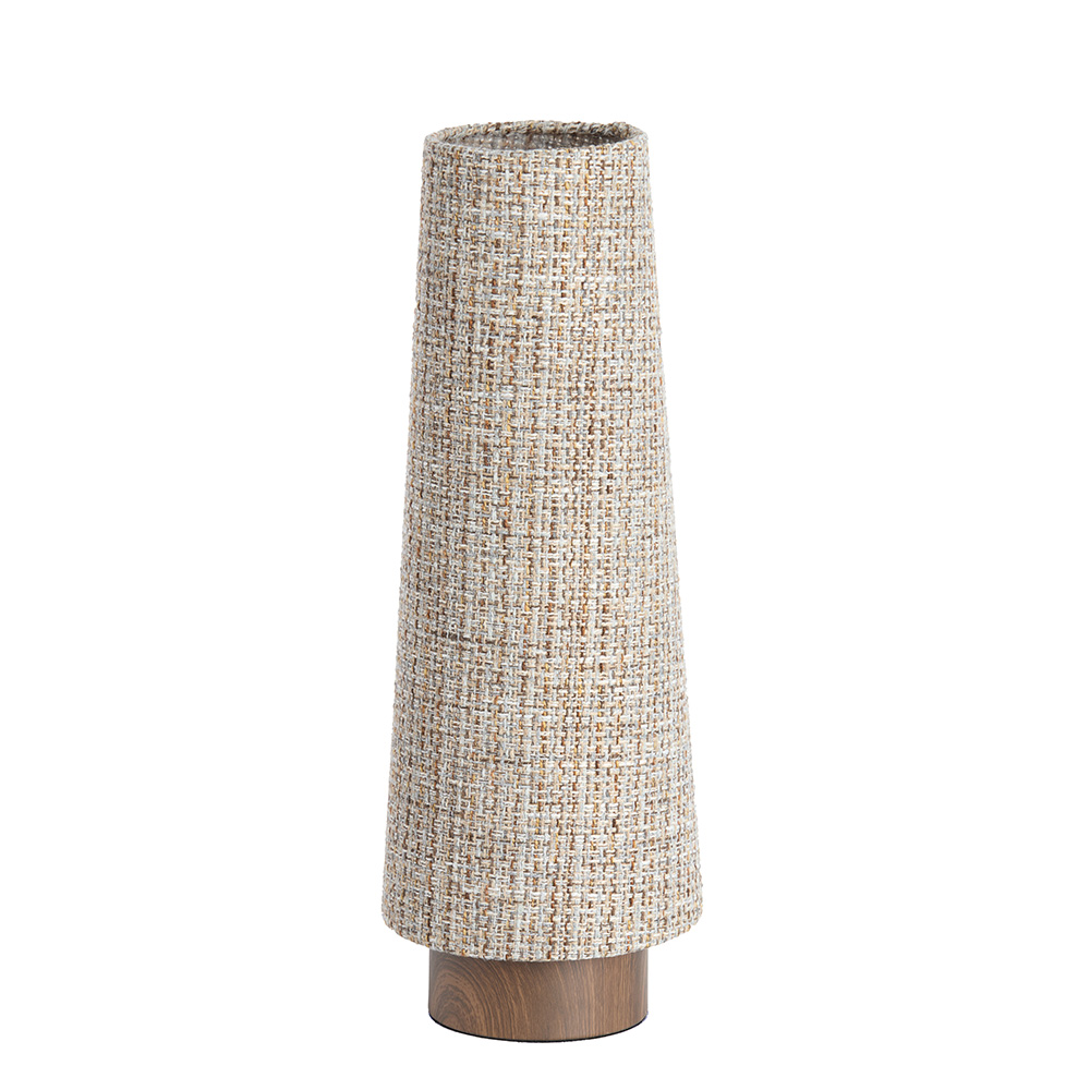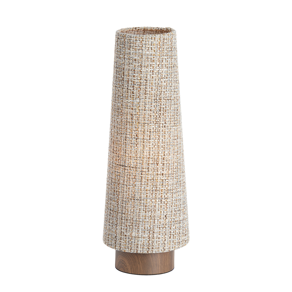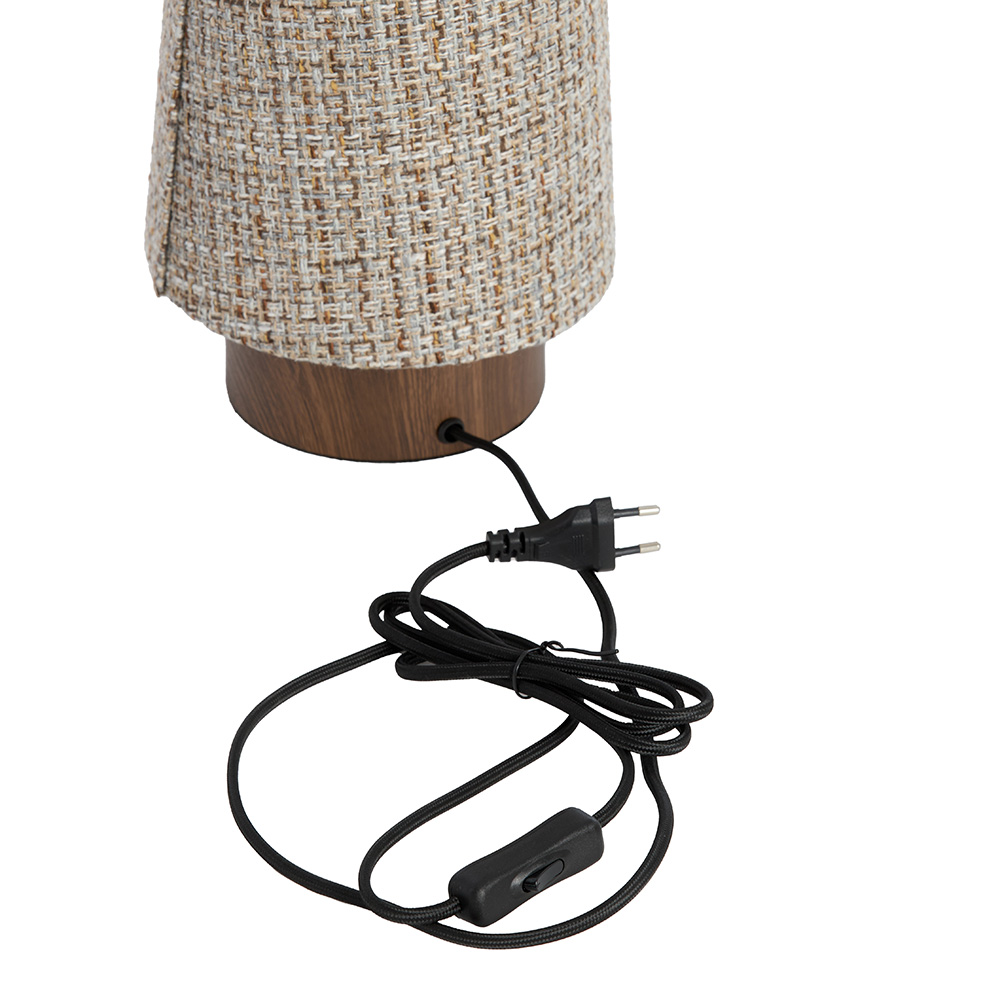 Deze sfeervolle lamp combineert een natuurlijke uitstraling met eigentijdse eenvoud. Het slanke ontwerp van de lampenkap is bekleed met een geweven stof in zachte beige en grijstinten, wat zorgt voor een subtiele textuur en een gezellige sfeer. De houtlook van het voetstuk in warme tinten versterkt het organische karakter van de lamp en maakt hem een perfecte aanvulling op een rustieke of Scandinavische interieurstijl. De lamp biedt niet alleen functionele verlichting, maar dient ook als een decoratief statement in elke kamer. Het bijgevoegde schakelsysteem aan de kabel zorgt voor gemakkelijke bediening, waardoor deze lamp zowel praktisch als stijlvol is.