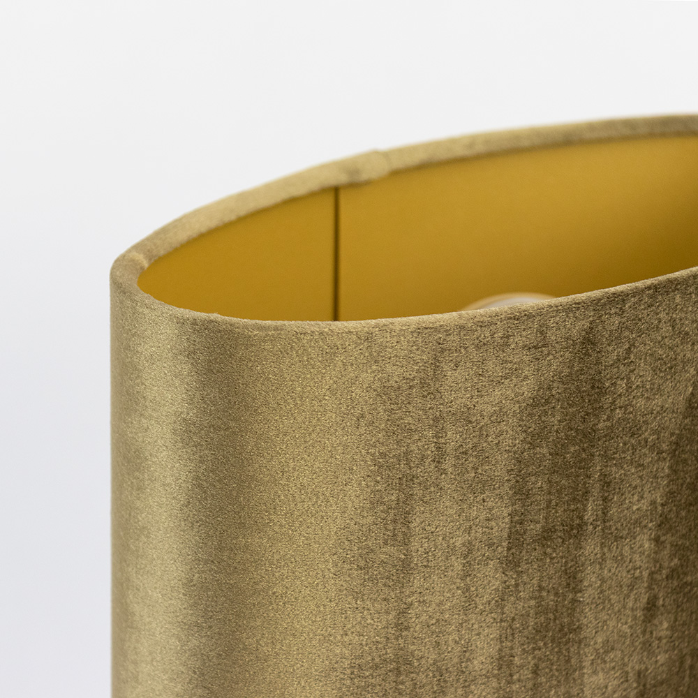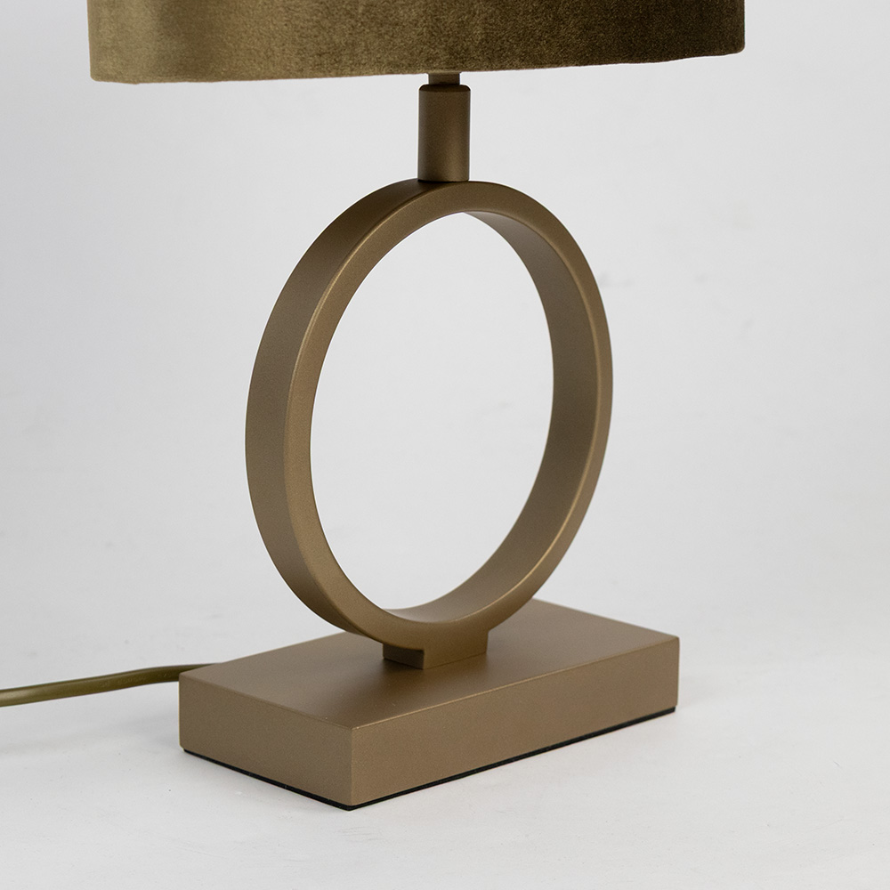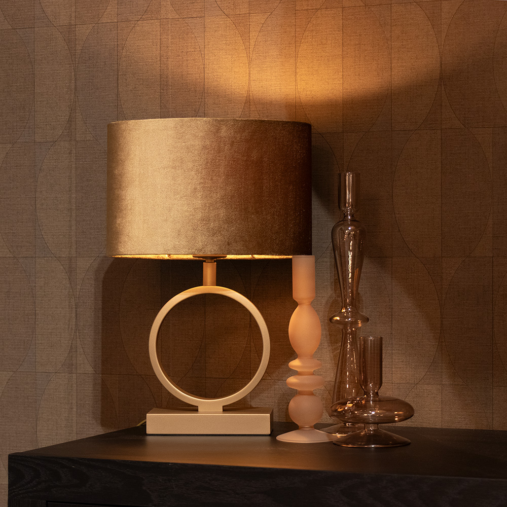 Deze prachtige tafellamp is een echte eyecatcher voor je interieur. De moderne ringvormige voet in een matte goud-/bronskleur straalt luxe uit en vormt een stijlvol contrast met de fluweelzachte lampenkap in een warme tint. De ovalen kap zorgt voor een zachte en sfeervolle lichtverdeling, perfect voor in de woonkamer, slaapkamer of hal. Dankzij het unieke ontwerp en de rijke materialen voegt deze lamp niet alleen licht, maar ook karakter toe aan je ruimte. De lamp is voorzien van een snoerschakelaar voor eenvoudige bediening.