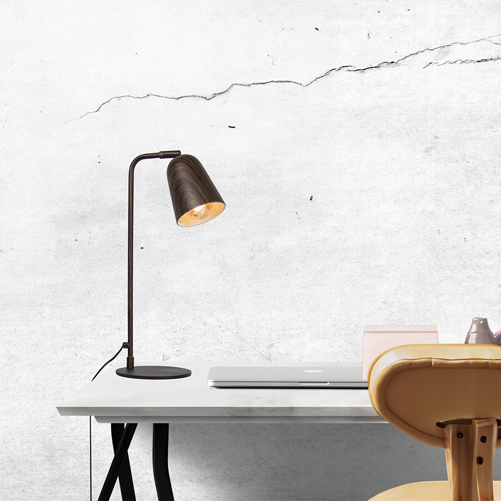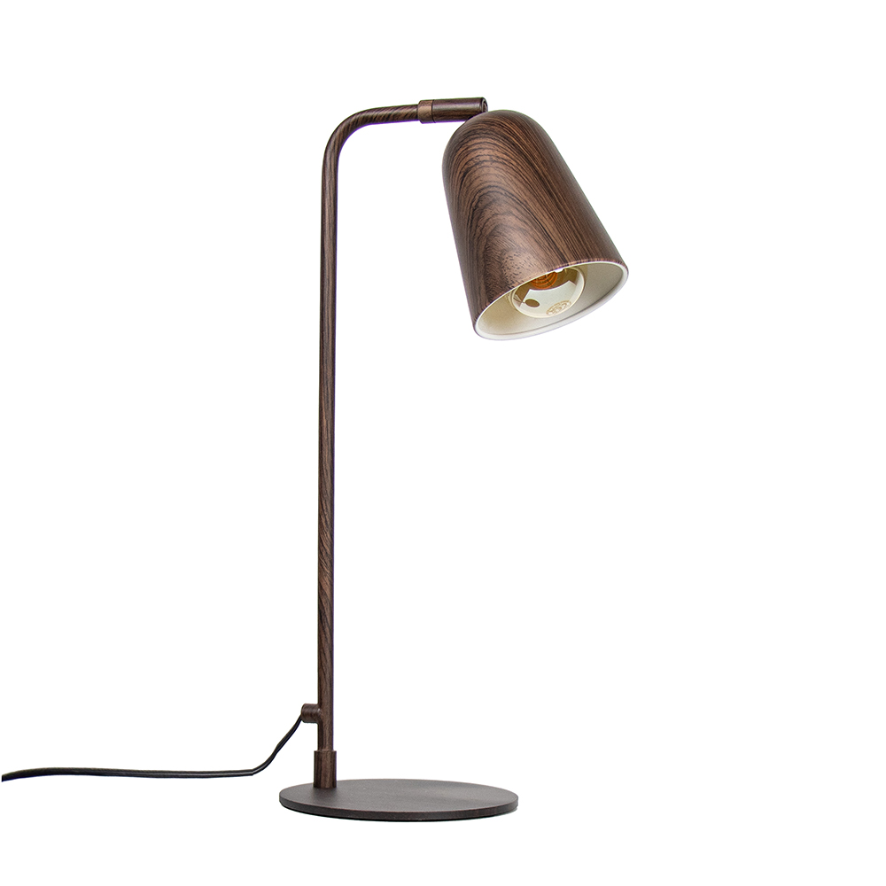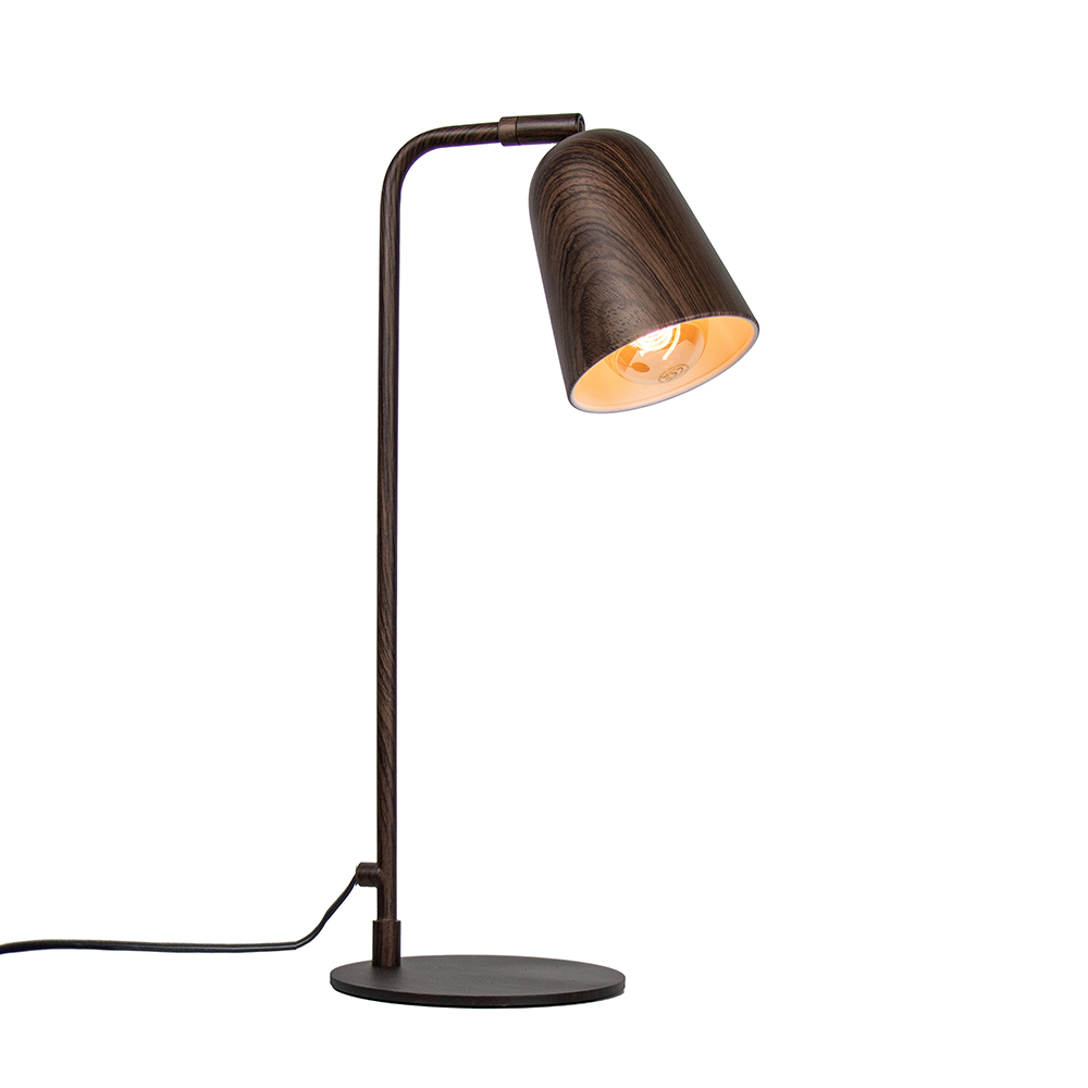 Deze leuke retro tafellamp is is de perfecte toevoeging aan uw kantoor! De lamp is gemaakt van metaal en voorzien van een houtlook in een donker bruine kleur. De lamp is verstelbaar door de kap te kantelen en/of te draaien. Zo kunt u de lamp helemaal naar wens verstellen! Ideaal voor op een bureau. De retro lamp heeft een hoogte van 47 cm en is voorzien van een zwart snoer van 165 cm met een schakelaar op 35 cm. De retro tafellamp wordt excl. lichtbron geleverd.