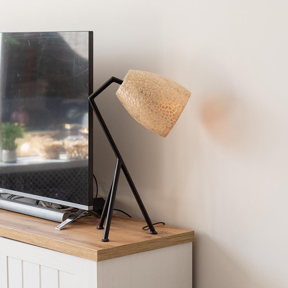 Een leuke en sfeervolle toevoeging op een kast of dressoir. Deze driepoot tafellamp heeft een zwart metalen voet die de schelpen kap ondersteund. De kap is gemaakt van gebroken stukjes capiz schelpen die op een fiberglas mal worden gelegd. Dit zorgt ervoor dat de kap een sfeervol effect geeft wanneer de lamp wordt ingeschakeld. Dit wordt nog eens versterkt door de warme kleuren in de kap, creme, bruin en goud. De sfeervolle schelpen tafellamp is voorzien van een zwart snoer van 170 cm, met een schakelaar op 50 cm van de lamp. De schelpenlamp is te combineren in diverse woonstijlen als beach, landelijk, bohemian of Oosters. De zwarte tafellamp met schelpenkap wordt geleverd zonder lichtbron (E27).