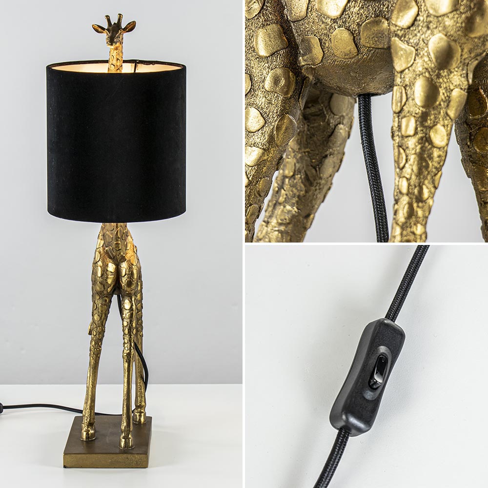 Helemaal volgens de huidige trends. Invloeden uit de natuur zien we steeds meer in het interieur. Denk aan prints of foto’s, maar waarom ook geen verlichting? Deze leuke giraffe maakt jouw trendy interieur helemaal af. Het antieke brons is helemaal hot en mooi gecombineerd met een chique velourse kap in het zwart. De ronde kap is mooi verwerkt in de nek van de giraffe waardoor de kop er leuk bovenuit steekt. De tafellamp is voorzien van een zwart snoer welk aan de onderzijde van de buik is verwerkt. Het snoer heeft een lengte van 180 cm, met een knipschakelaar op 50 cm. De lichtbron is exclusief.