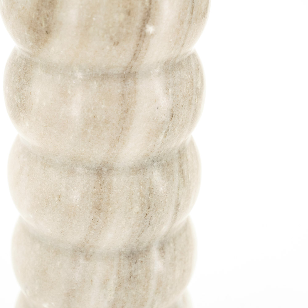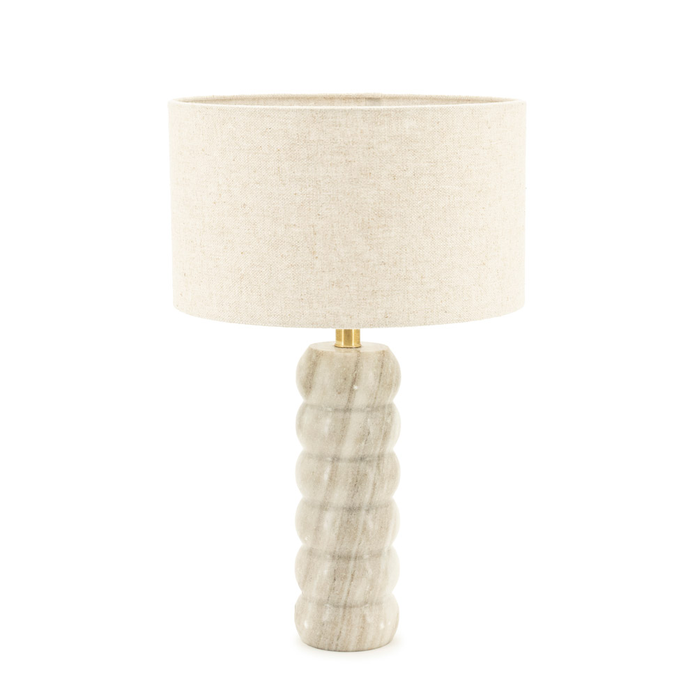 Specificaties: • Producttype: Tafellamp • Kleur: Beige • Afmetingen: Ø 35 × H 55 cm • snoerlengte 150 cm • Materiaal: Linnen kap, marmeren voet • Fitting: E27 • Lichtbron: Exclusief • Dimbaar: Ja, met geschikte lichtbron en externe dimmer (niet inbegrepen)