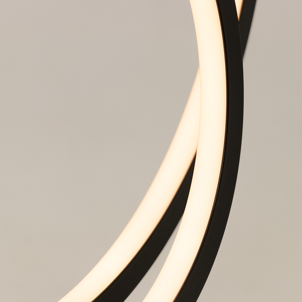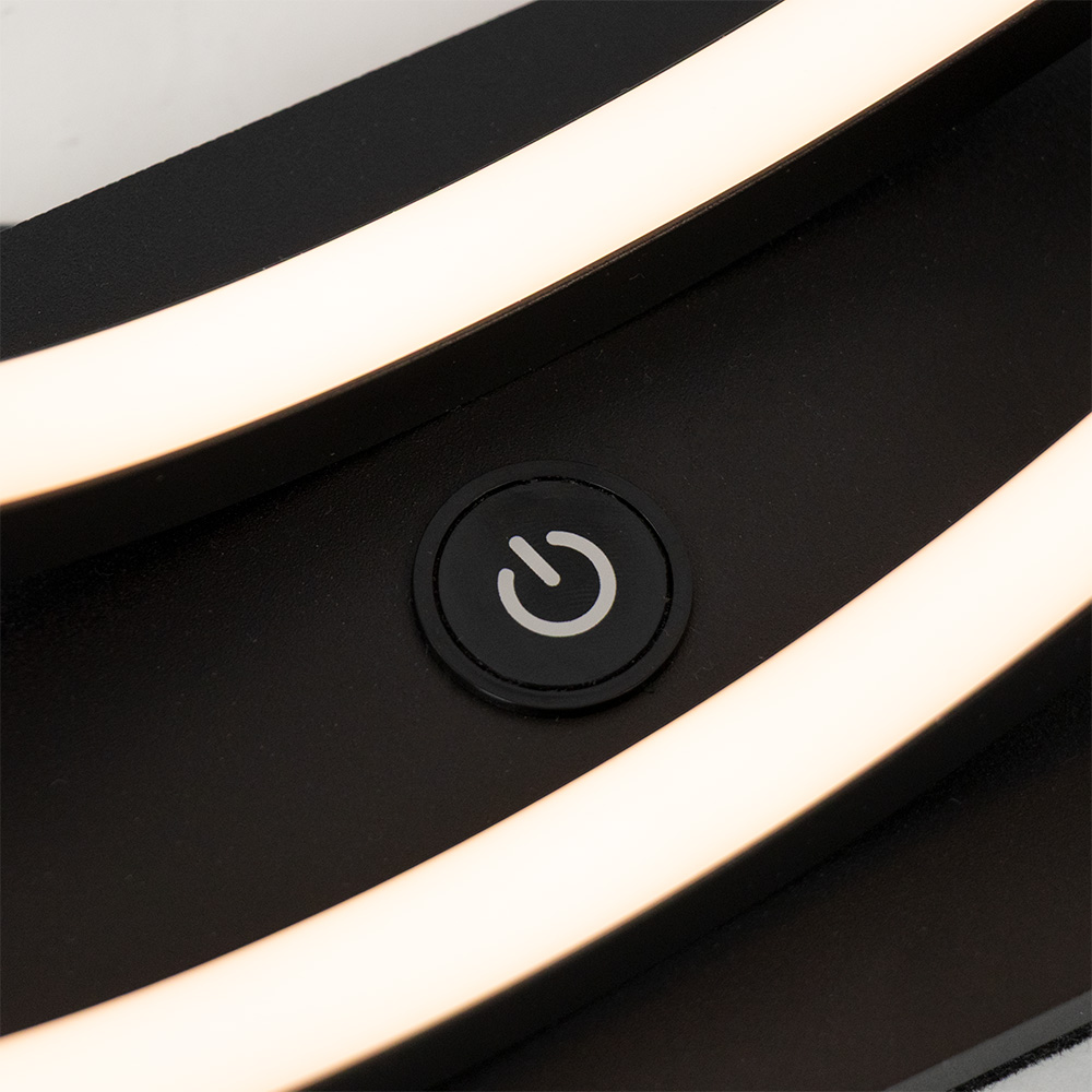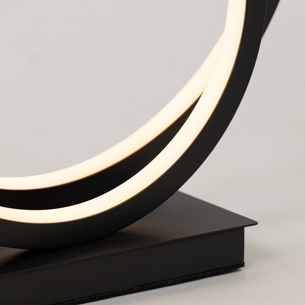 Deze moderne LED tafellamp is een stijlvol designobject dat meteen in het oog springt. De lamp bestaat uit twee elegant overlappende ringen die een speels en ruimtelijk effect creëren. De zwarte afwerking in combinatie met de geïntegreerde LED-verlichting aan de binnenzijde van de ringen zorgt voor een warm en sfeervol licht, perfect als accentverlichting in je interieur. De tafellamp is voorzien van een touchknop op de voet, waarmee je de lamp eenvoudig aan- en uitschakelt. Door het minimalistische en tegelijkertijd kunstzinnige ontwerp past deze lamp uitstekend in moderne woonkamers, slaapkamers of werkplekken.
