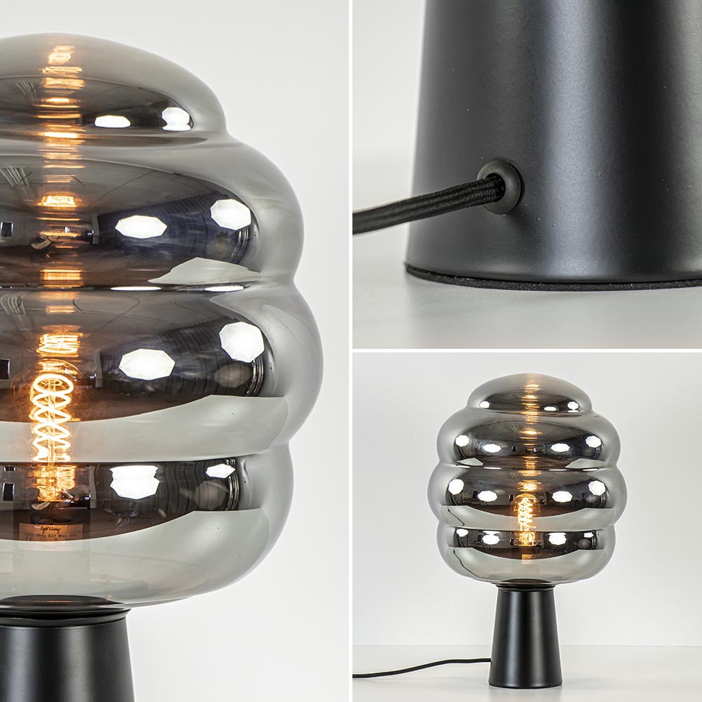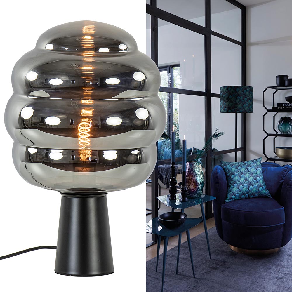 Tafellamp Misty van Light and Living is een sfeervolle lamp die mooi past in een luxe, retro of trendy interieur. Door de kleurstelling van het mat zwart en het smoke glas matcht de lamp gemakkelijk in diverse woonstijlen. De voet is gemaakt van metaal en uitgevoerd in het mat zwart. Het smoke glas glas krijgt door de verschillende bollingen een speels effect wat de lamp juist dat trendy gevoel geeft. Tafellamp misty is voorzien van een zwart stof omwonden snoer met een lengte van 150 cm en een knipschakelaar op 55 cm in het snoer. De sfeervolle tafellamp wordt geleverd zonder lichtbron (E27).