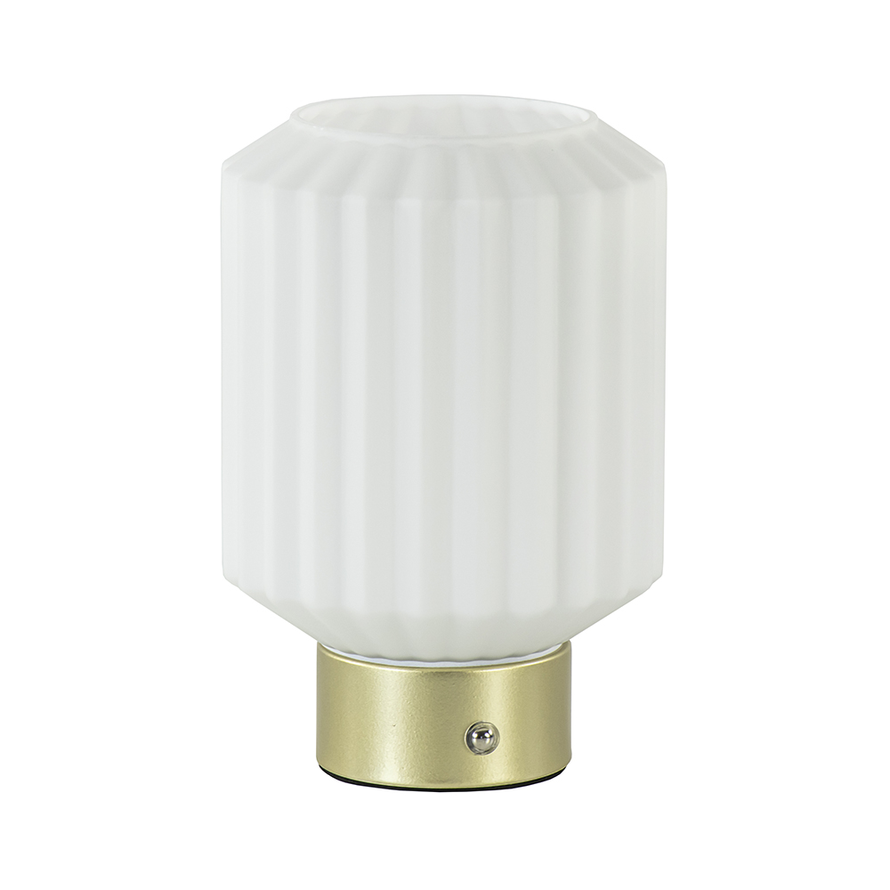 – afm: Ø13×19,5 cm – voet: Ø7,5×4 cm – kap: Ø13×15,5 cm – glas, wit – metaal, goud – inclusief LED – 100 lumen – 3000 Kelvin – 3-standen dimbaar – oplaadbaar – inclusief USB kabel