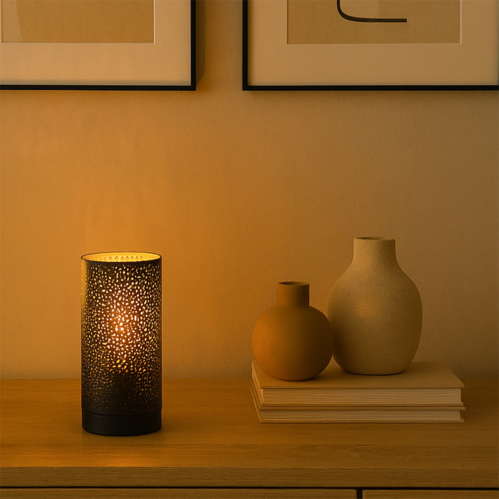 Waarom kiezen voor deze lamp? • Luxe uitstraling: Zwart met goud voor een stijlvolle look. • Speels lichteffect: Prachtig patroon dat warme lichtaccenten creëert. • Compact en veelzijdig: Perfect voor diverse ruimtes in huis.