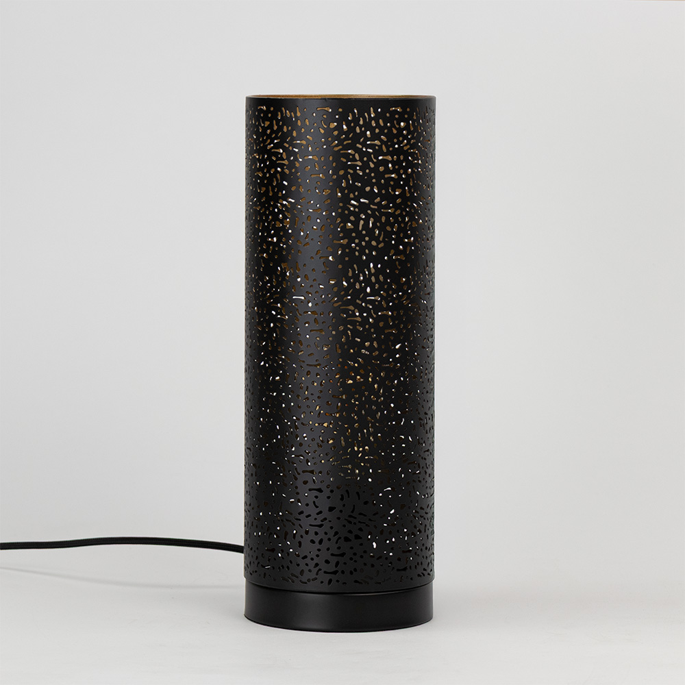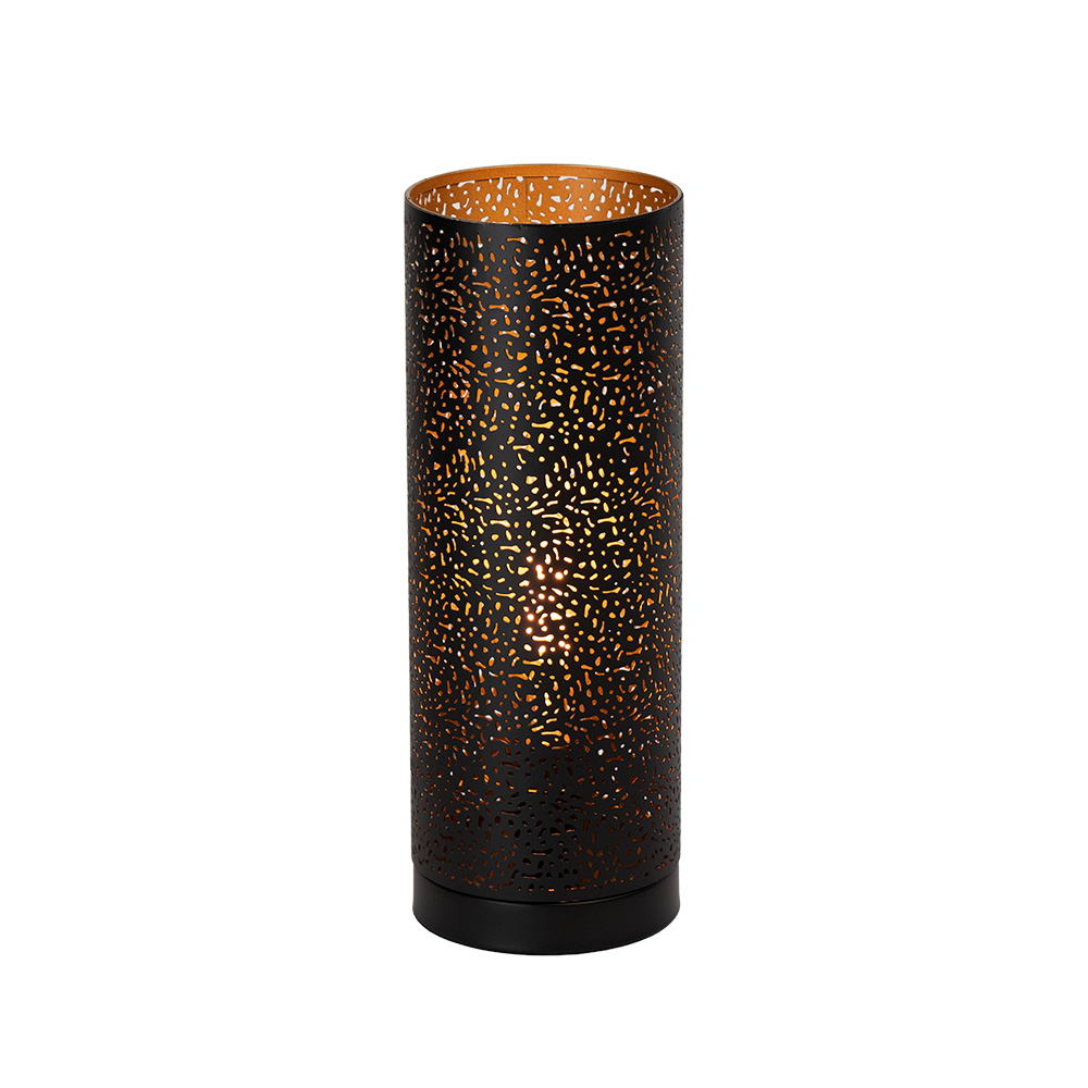 Een sfeervolle tafellamp met een luxe, moderne uitstraling! Tafellamp Zara creëert direct een warme en gezellige sfeer dankzij het uitgesneden patroon en het gouden binnenwerk. Het speelse lichteffect van de zwarte metalen kap zorgt voor prachtige lichtschaduwen in de ruimte. De combinatie van zwart en goud geeft deze lamp een stijlvolle en elegante uitstraling. Perfect voor in de woonkamer, slaapkamer of op een dressoir.