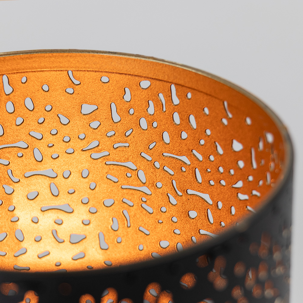 Waarom kiezen voor deze lamp? • Luxe uitstraling: Chique combinatie van zwart en goud. • Speels lichteffect: Het uitgesneden patroon geeft een warme lichtverdeling. • Compact en veelzijdig: Perfect voor nachtkastjes, dressoirs of bijzettafels.