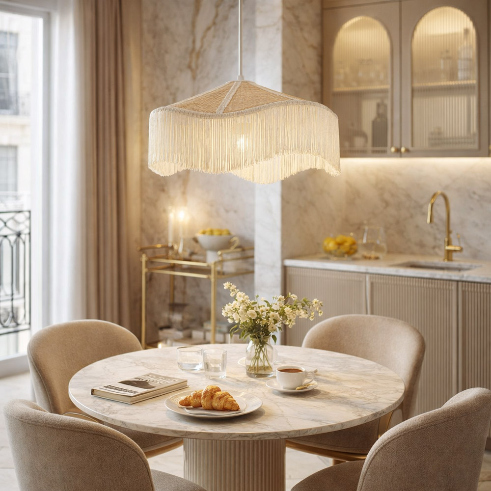 Deze hanglamp komt prachtig tot zijn recht boven een ronde eettafel van circa 120–140 cm, maar is ook een stijlvolle keuze boven een bijzettafel of in een gezellige zithoek. De gebroken wit/crème variant oogt zacht en luchtig, terwijl de burgundy uitvoering juist zorgt voor een warm en uitgesproken accent in het interieur.