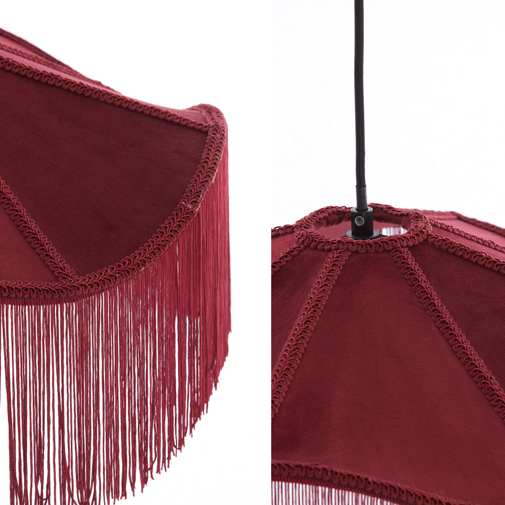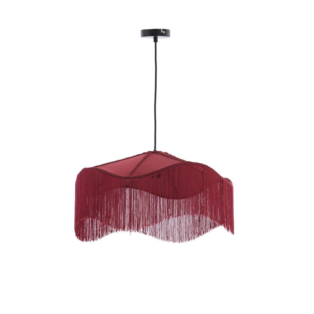 Highlights • Ronde hanglamp met decoratieve franjerand • Zacht, diffuus licht met speels schaduweffect • Verkrijgbaar in gebroken wit/crème en burgundy • Opvallend design met subtiele retro-uitstraling • Perfect boven een eettafel, ronde tafel of zithoek