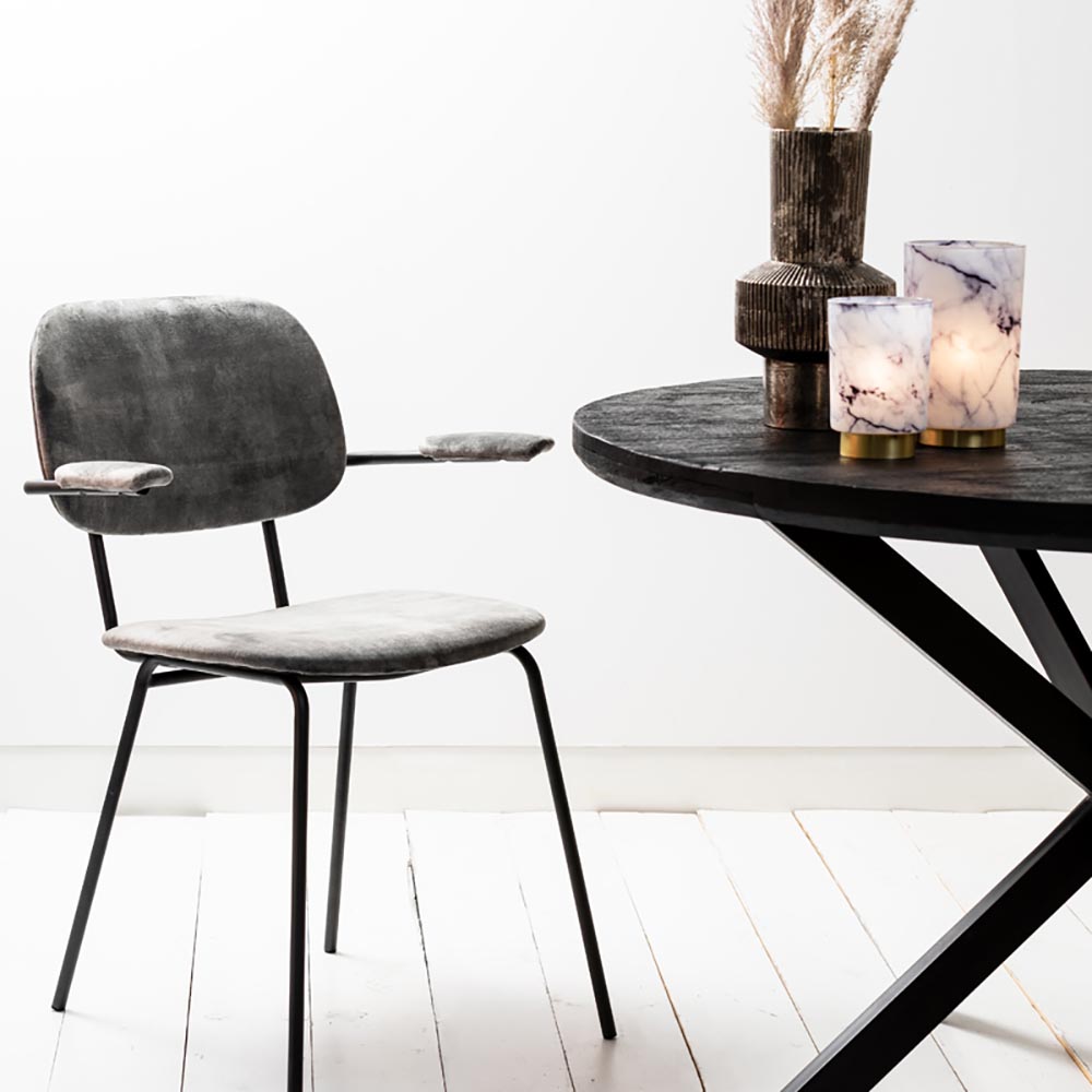 Dit trendy stoeltje maakt uw eetkamer helemaal af! Super leuk bij de robuuste houten tafels die we nu veel zien, maar met een slank zwart blad matcht deze eetkamerstoel ook perfect. De eettafelstoel heeft een fijn zitcomfort dat wordt versterkt door de armleuningen. Deze hebben een hoogte van 67 cm zodat ze gemakkelijk onder de tafel kunnen schuiven. De stoel heeft een velvet stoffen zitvlak, rugleuning en afwerking op de armleuning. De velvet stof is helemaal trendy en gemakkelijk te combineren in diverse woonstijlen. Het metalen frame loopt door in de pootjes wat een luchtig geheel geeft en is voorzien van een donker grijze poedercoating. De eetkamerstoel Emma van Light and Living is verkrijgbaar in twee kleuren, grijs en petrol.