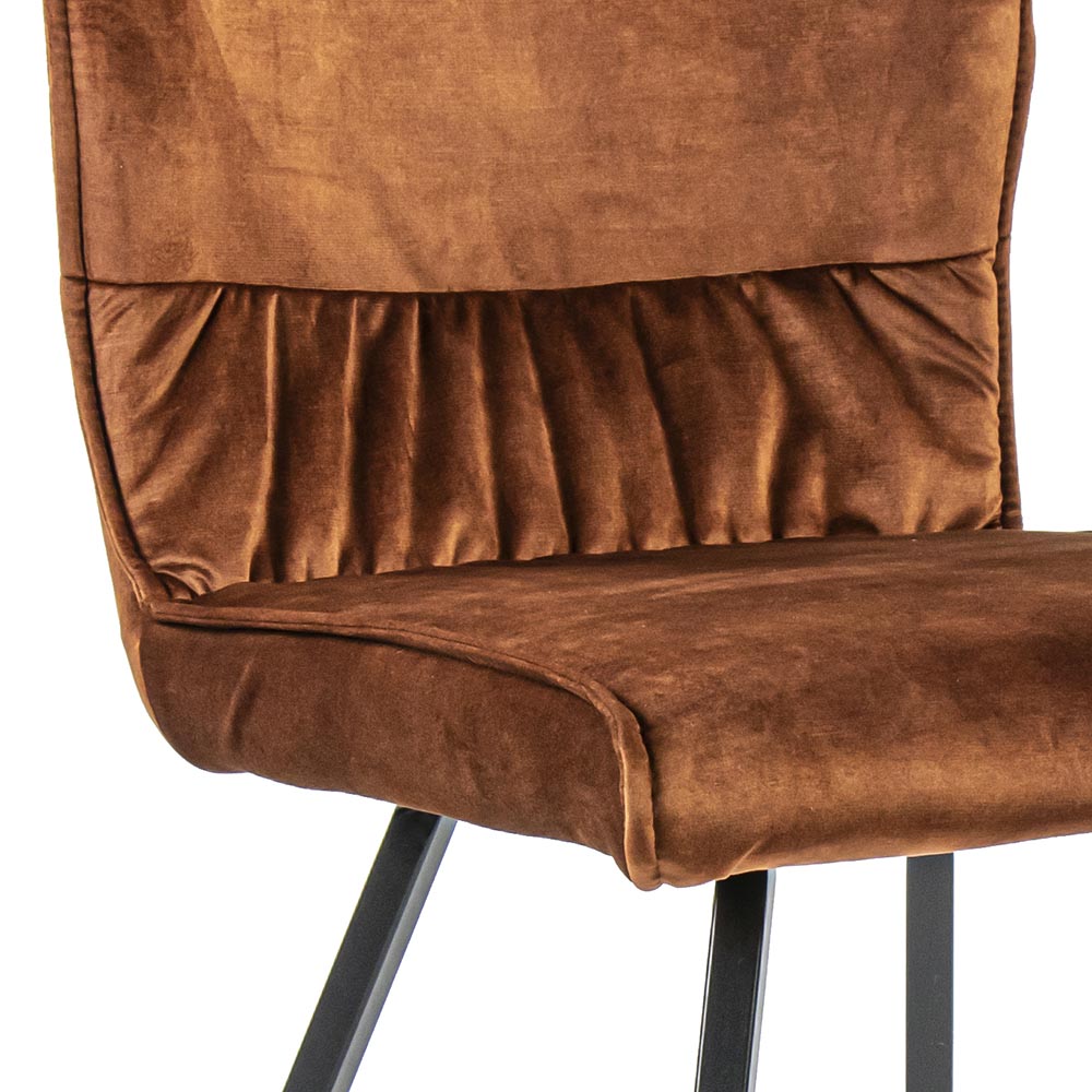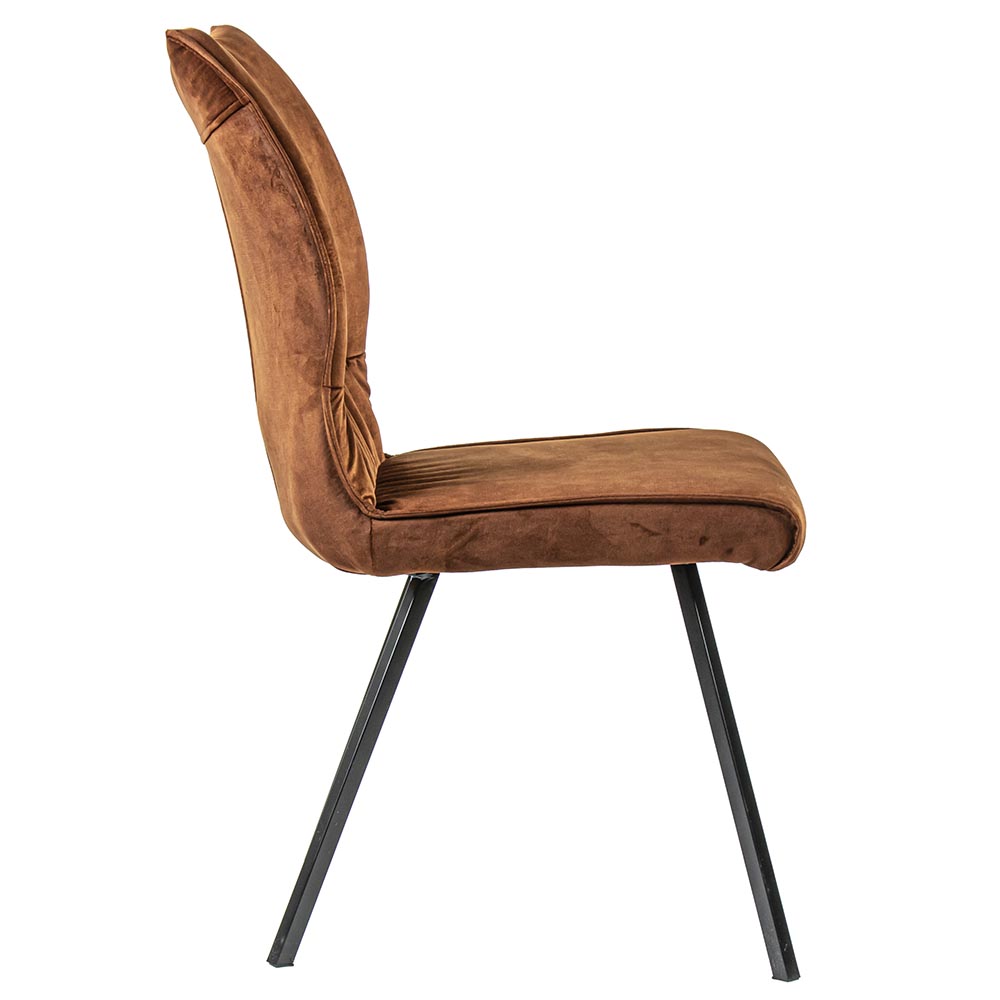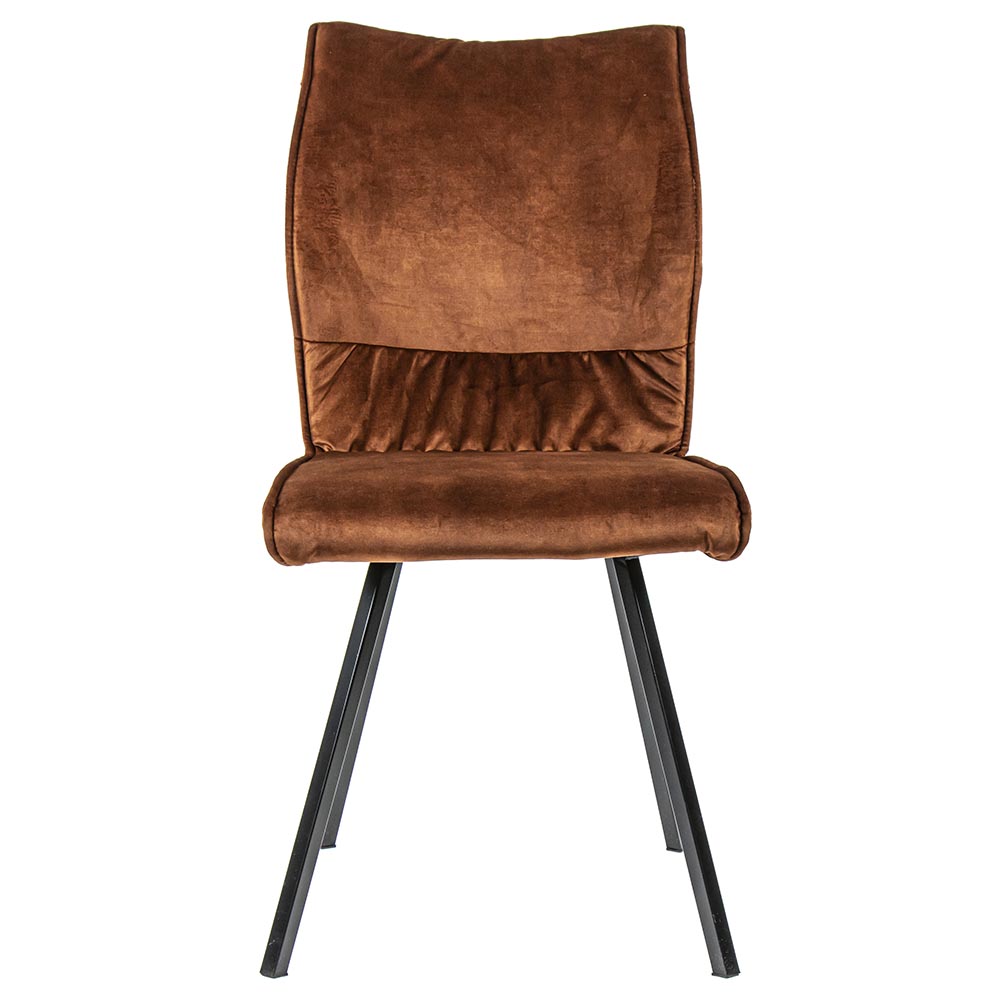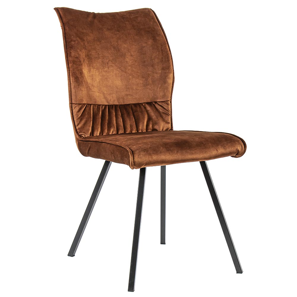 Een trendy stoeltje met een landelijke uitstraling. De eetkamerstoel heeft een zitting die doorloopt in de rug en volledig is voorzien van een velourse stof. Dit geeft een luxe look en feel aan het stoeltje. De pootjes zijn van metaal en voorzien van een zwarte finish. Leuk met zes rond een tafel en te combineren in diverse kleuren.