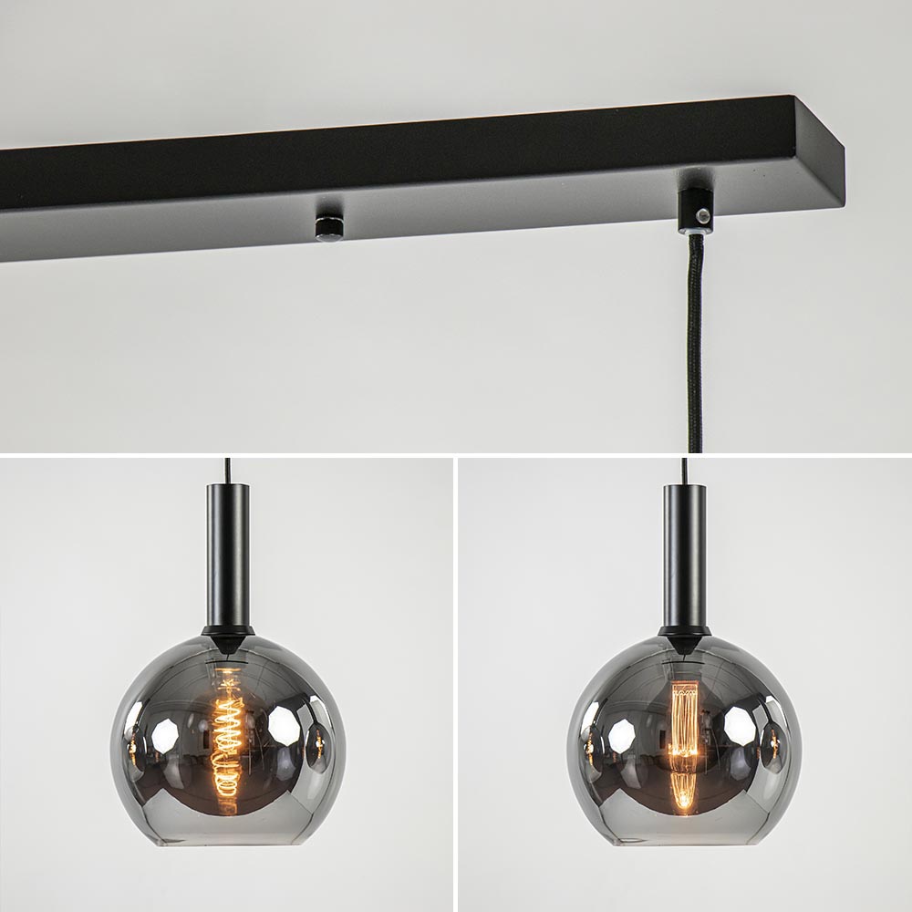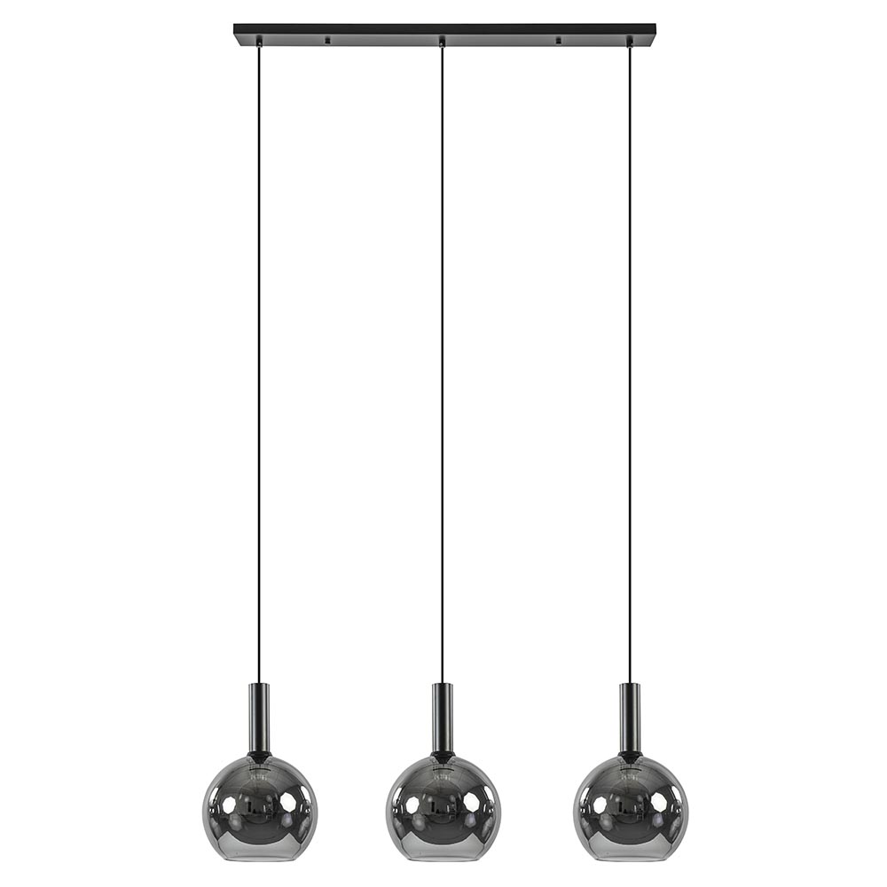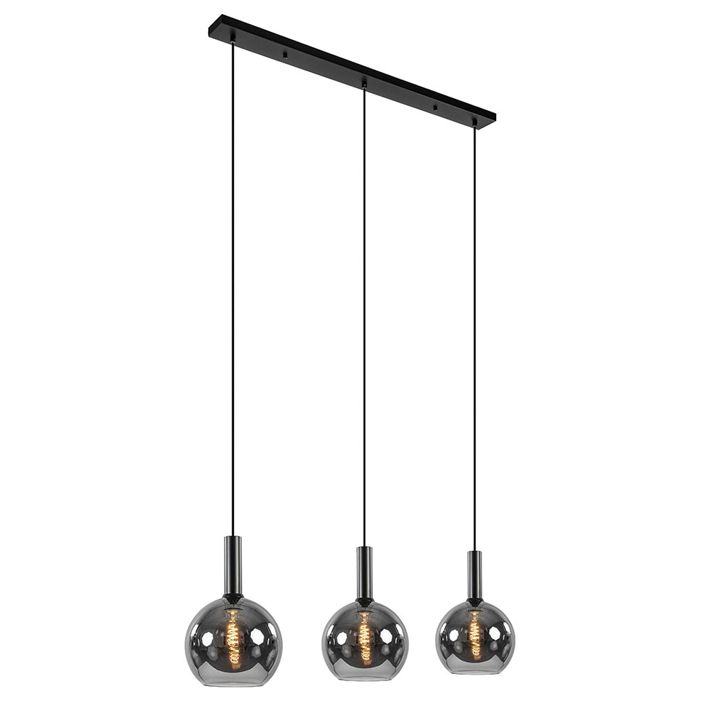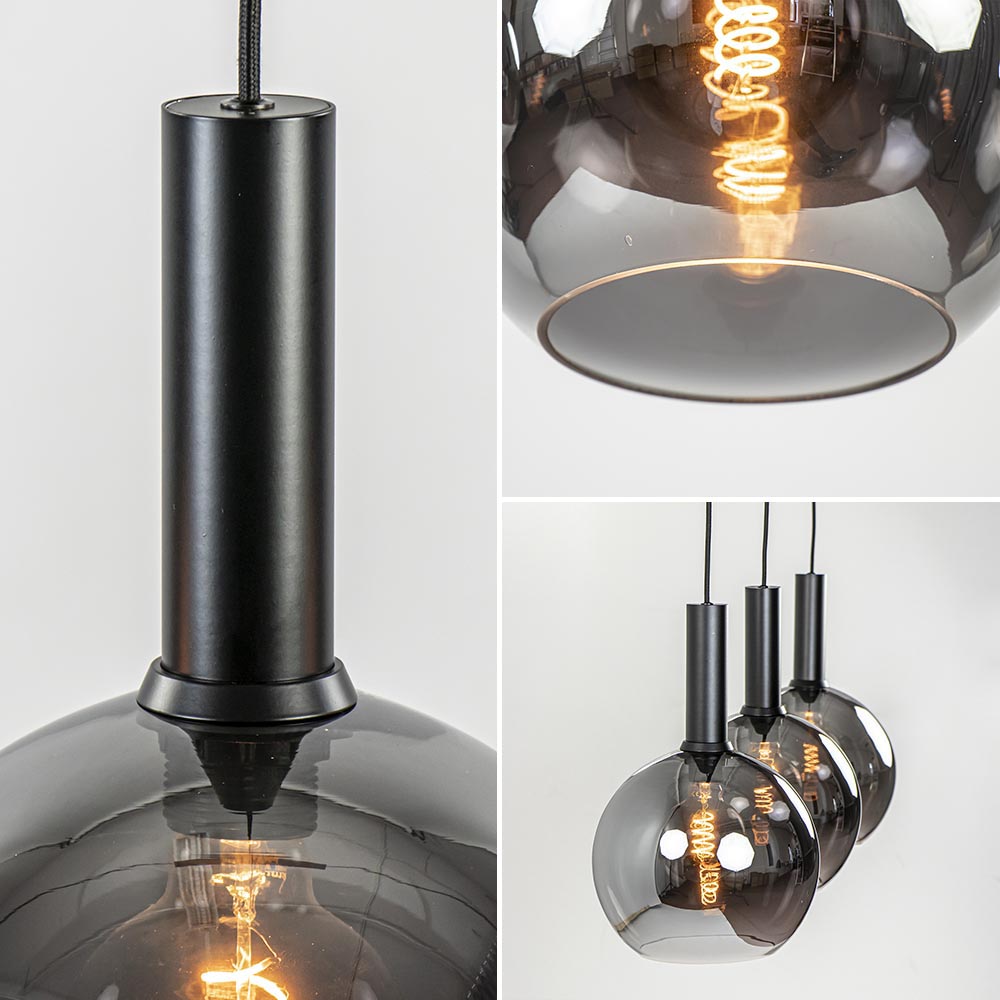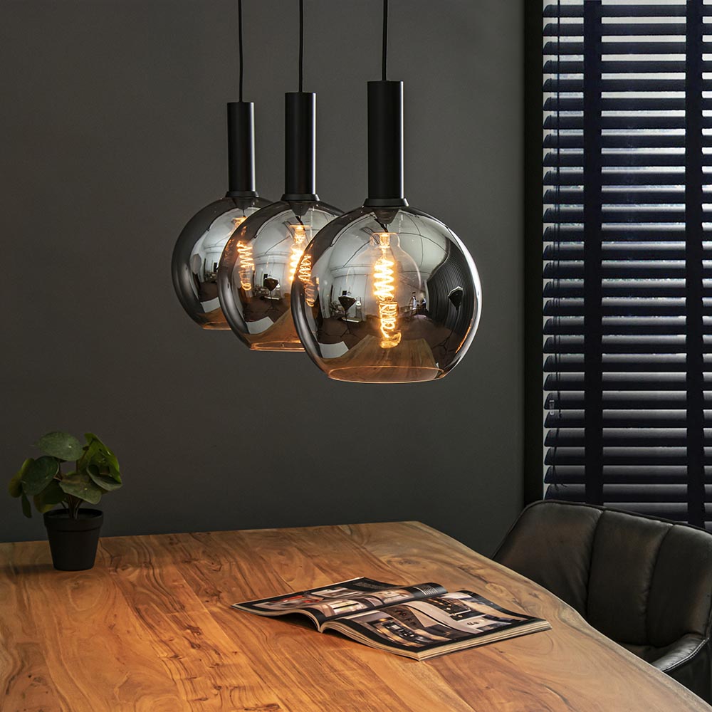 Helemaal binnen de huidige trends en sfeervol voor boven de eettafel. Deze trendy hanglamp is een echte must voor het interieur. De hanglamp is voorzien van 3 smoke glazen bollen met een titanium coating. Dit zorgt voor een spiegelend effect en geeft de hanglamp echt een luxe uitstraling. Dit wordt nog eens versterkt door de combinatie met de mat zwarte cilindervormige fittingen. De 3-lichts hanglamp heeft een maximale hoogte van 185 cm en wordt aan het plafond bevestigd met een balk van 90 cm. De trendy hanglamp is dimbaar middels een externe dimmer (exclusief) en wordt geleverd zonder lichtbron (3x E27).