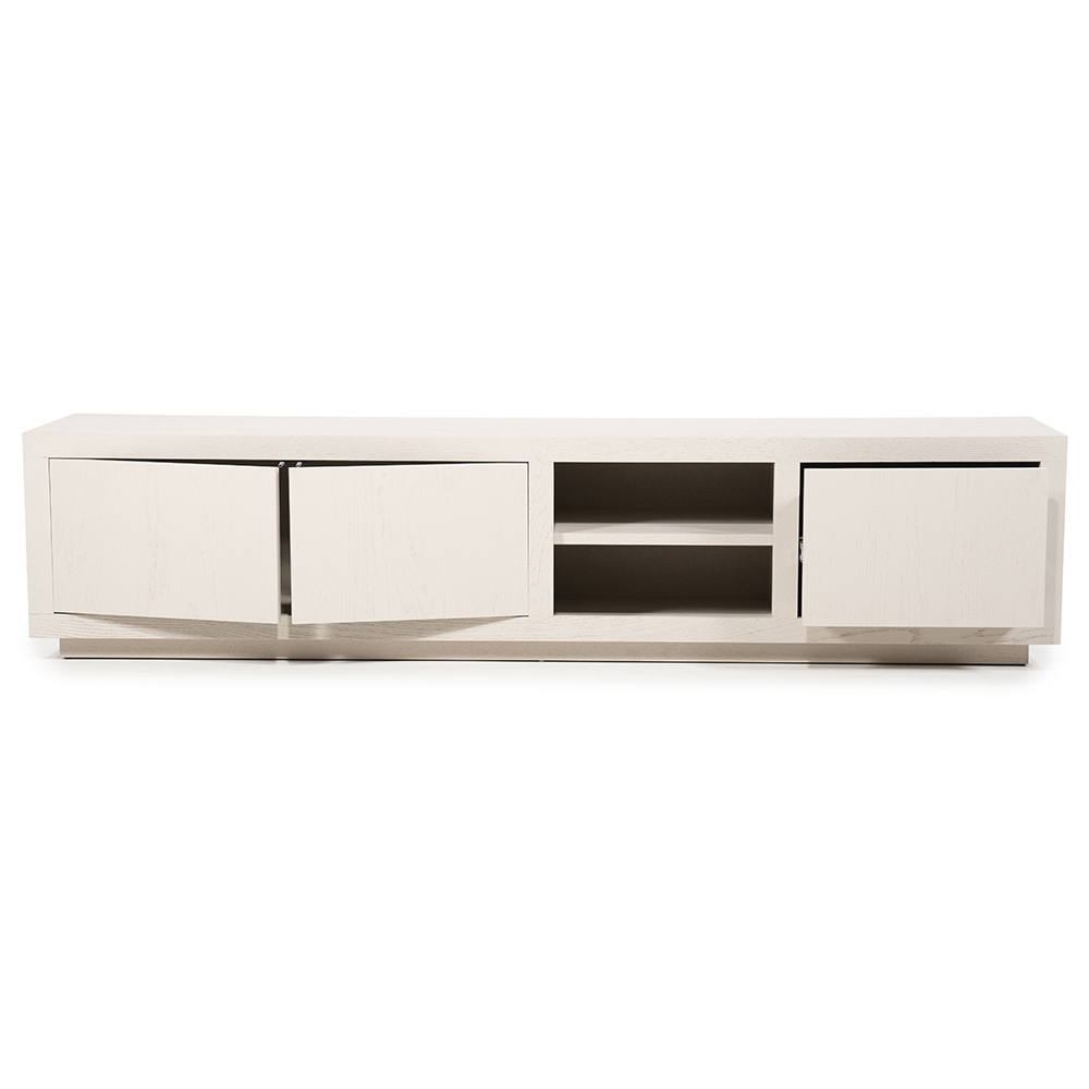 Dit stijlvolle TV-meubel combineert modern minimalisme met praktische functionaliteit. Uitgevoerd in een zachte, lichte houttint, geeft dit meubel een rustige en eigentijdse uitstraling aan jouw woonkamer. De subtiele houtnerf zorgt voor een warme en natuurlijke uitstraling, terwijl de strakke lijnen perfect aansluiten bij een hedendaags interieur. Het meubel beschikt over ruime opbergmogelijkheden achter twee elegante deuren en in een lade, waardoor kabels en apparatuur netjes uit het zicht blijven. In het midden bevinden zich twee open schappen, ideaal om apparatuur of decoratieve items te plaatsen. Dankzij de hoogwaardige afwerking en solide constructie biedt dit meubel niet alleen voldoende opslagruimte, maar ook een luxe uitstraling die je interieur direct naar een hoger niveau tilt.