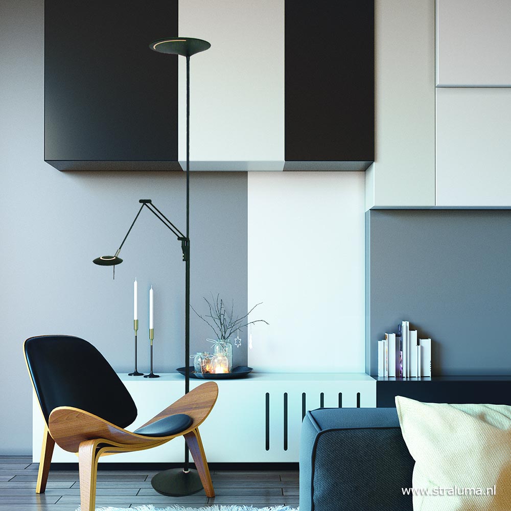Homepagina / Lampen / Leeslampen / Uplighter zwart met leeslamp – 2 x pushdimmer