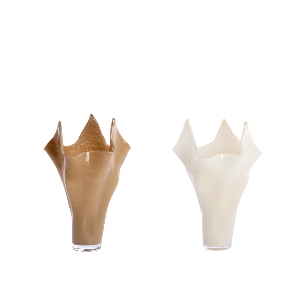 Deze vaas Aiora in bruin glas heeft dezelfde elegante vorm als de melkglazen variant, maar krijgt door de warme bruintint een rijkere, meer uitgesproken uitstraling. De ronde lijnen en het subtiel glanzende glas maken hem perfect als sfeervol object op een dressoir, bijzettafel of in een open kast. Mooi met enkele takken of puur als decoratief statement.