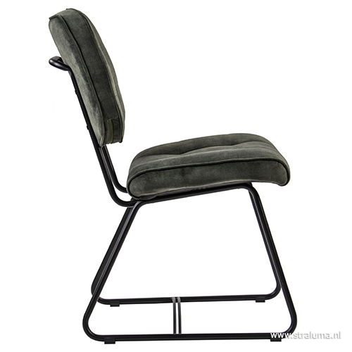 Dit trendy stoeltje past helemaal binnen de trends van nu. De strakke lijnen van de mat zwarte poten passen mooi bij een landelijk of modern interieur en de velours stoffen zitting en rugleuning geven de eetkamerstoel een luxe uitstraling. Op de rug is de stoel voorzien van een handvat zodat u de stoel gemakkelijk onder de tafel vandaan kunt schuiven. De velourse stoel heeft een hoog zitcomfort zodat tafelen en natafelen een waar genot is.
