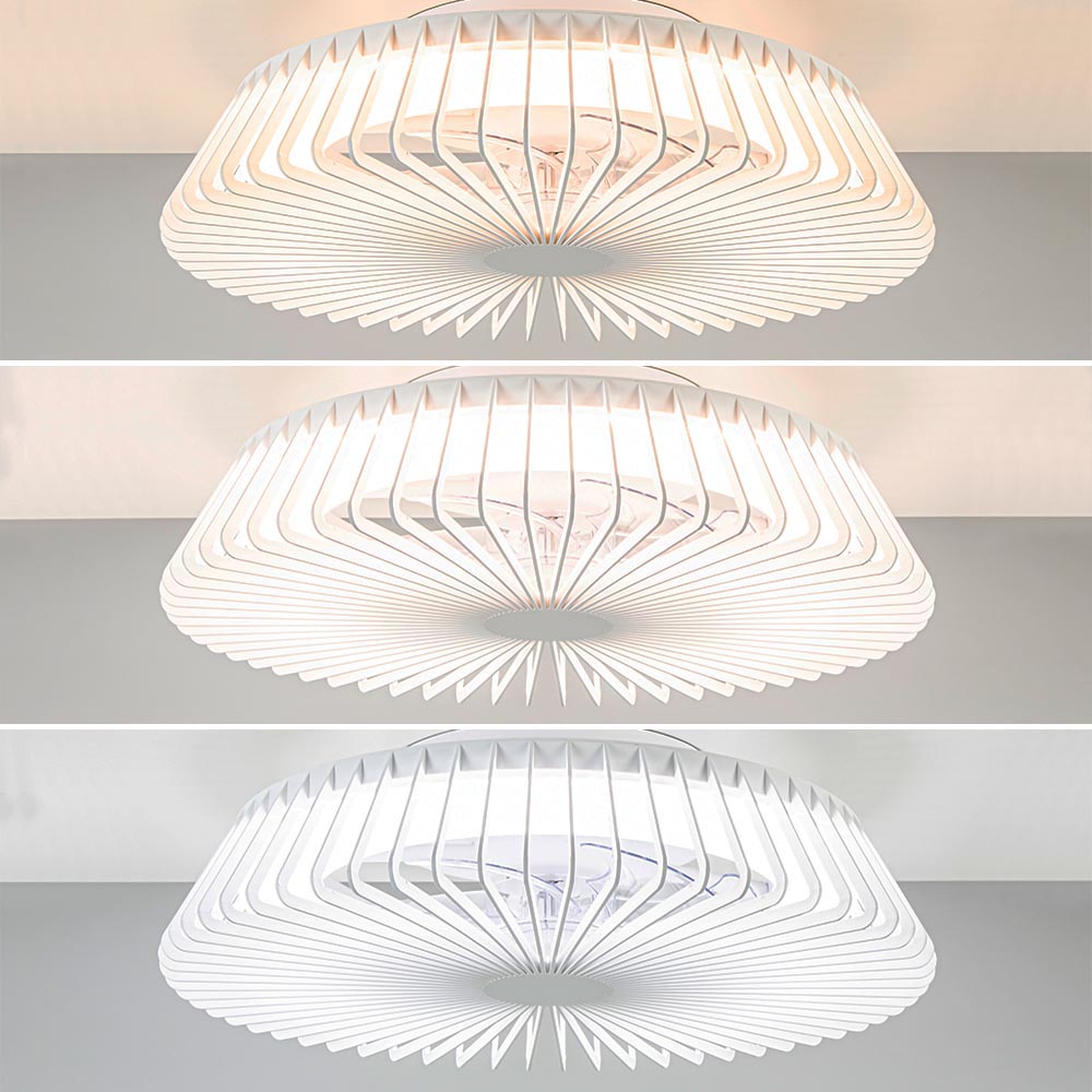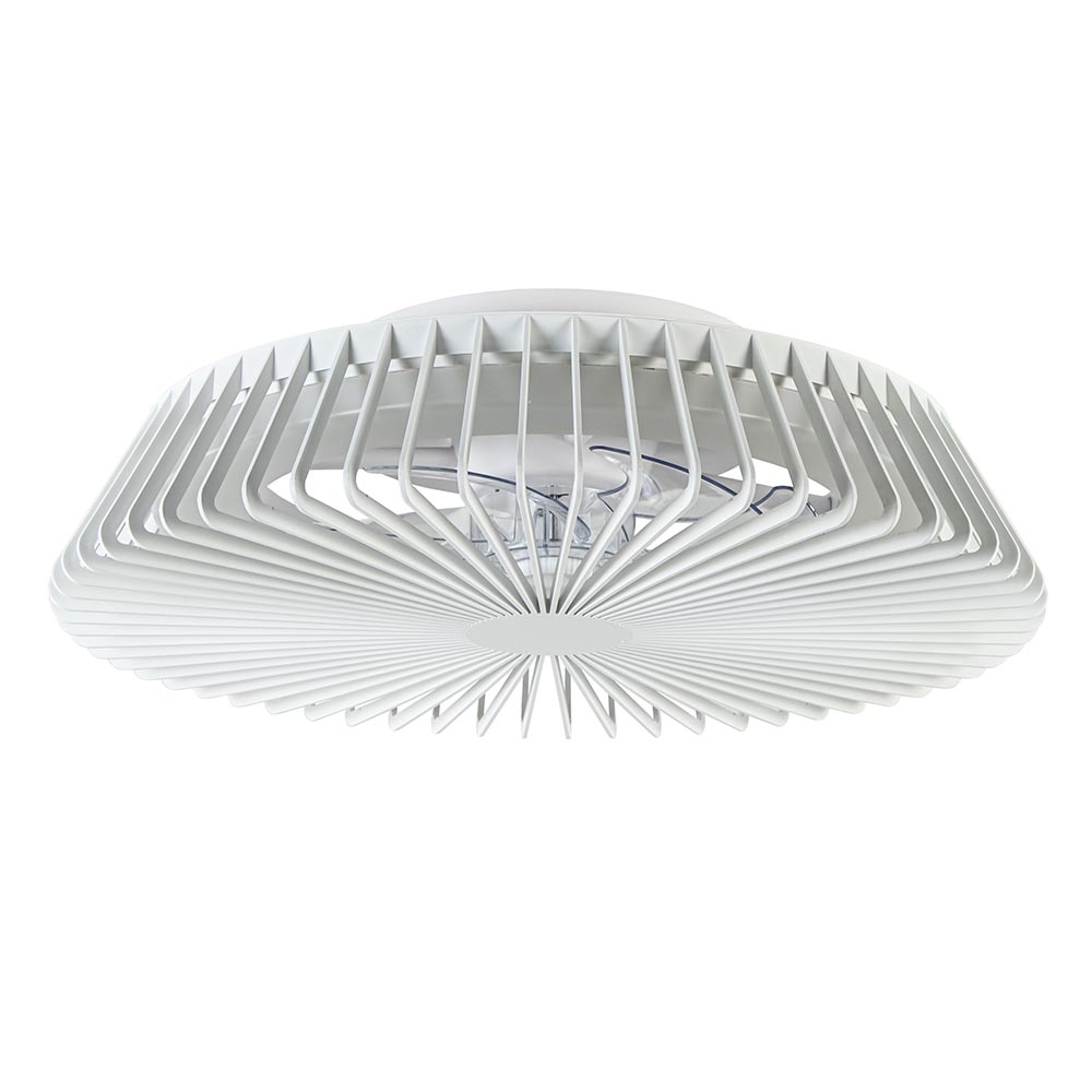 Een moderne design plafondventilator met LED zoals we deze nog niet eerder hebben gezien. De ronde ventilator oogt meer als een plafondlamp dan een ventilator maar heeft wel beide functies in één. De architectonische kap geeft de plafondventilator een design look die door de grootte van 63 cm doorsnede een mooie eye-catcher is. De moderne plafondventilator met lamp is voorzien van een geïntegreerd LED met een aantal functies. Zo kunt u de kleurtemperatuur kiezen tussen de 2700 en 5000 Kelvin en kunt u gemakkelijk de lamp dimmen. Dit bediend u allemaal gemakkelijk en snel met de meegeleverde afstandsbediening of via uw mobiele telefoon en app. Deze verbindt u via Bluetooth met de lamp zodat u vanaf uw bank of bed snel de gewenste instelling kunt maken. Een ideale plafondlamp en ventilator in één die ook nog eens een strakke design uitstraling heeft.