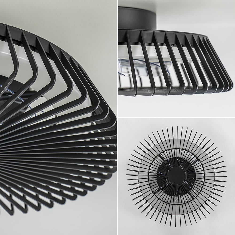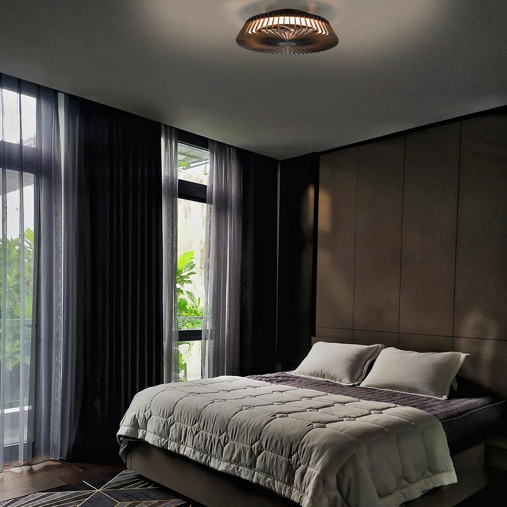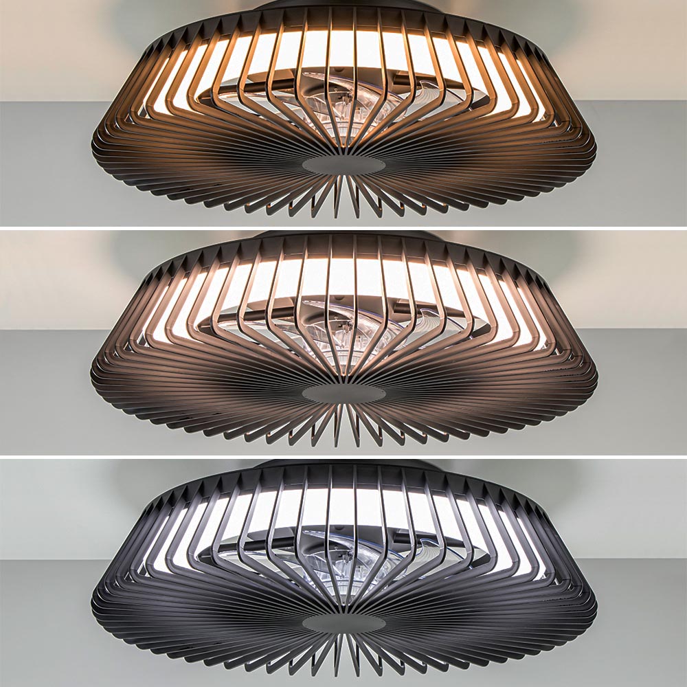 Een moderne design plafondventilator met LED zoals we deze nog niet eerder hebben gezien. De ronde ventilator oogt meer als een plafondlamp dan een ventilator maar heeft wel beide functies in één. De architectonische kap geeft de plafondventilator een design look die door de grootte van 63 cm doorsnede een mooie eye-catcher is. De moderne plafondventilator met lamp is voorzien van een geïntegreerd LED met een aantal functies. Zo kunt u de kleurtemperatuur kiezen tussen de 2700 en 5000 Kelvin en kunt u gemakkelijk de lamp dimmen. Dit bediend u allemaal gemakkelijk en snel met de meegeleverde afstandsbediening of via uw mobiele telefoon en app. Deze verbindt u via Bluetooth met de lamp zodat u vanaf uw bank of bed snel de gewenste instelling kunt maken. Een ideale plafondlamp en ventilator in één die ook nog eens een strakke design uitstraling heeft.