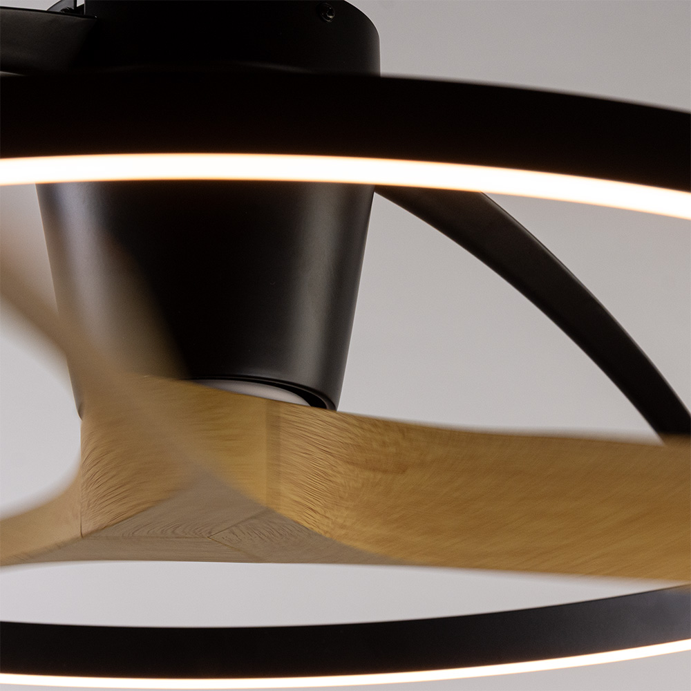 Strak, modern en functioneel! Deze ventilatorlamp combineert verlichting en verkoeling in één stijlvol ontwerp. De plafondlamp is uitgevoerd met een ronde zwarte metalen omlijsting en een geïntegreerde LED-ring die zorgt voor een gelijkmatige en sfeervolle verlichting. In het midden bevinden zich drie elegante bladen met een natuurlijke houtlook die zorgen voor een rustige luchtcirculatie in de ruimte. Dankzij de bijgeleverde afstandsbediening stel je eenvoudig zowel de lichtsterkte als de kleurtemperatuur (van warm wit tot koel wit) in. Ook de ventilator is in verschillende snelheden te regelen, voor een optimaal comfort het hele jaar door. Ideaal voor werkruimtes, woonkamers of slaapkamers waar stijl en functionaliteit samenkomen.