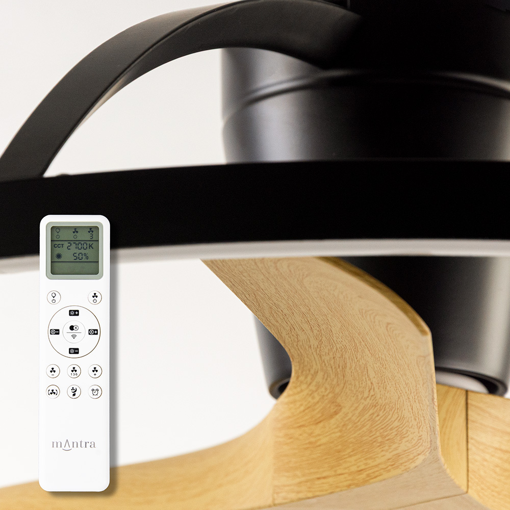 Details: – Afmeting: Ø75 x 21,5 cm – Bevestiging: Ø14,8 x 17 cm – Geïntegreerd LED – 32W – Kleur: Zwart & Houtlook – Kelvin: 2700 – 5000 – Lumen: 4000 – Dimbaar – Gewicht: 3,5 kg – Incl. Afstandsbediening – Zomer + winter stand – IP20 goedgekeurd – Geschikt voor een ruimte van 13m2