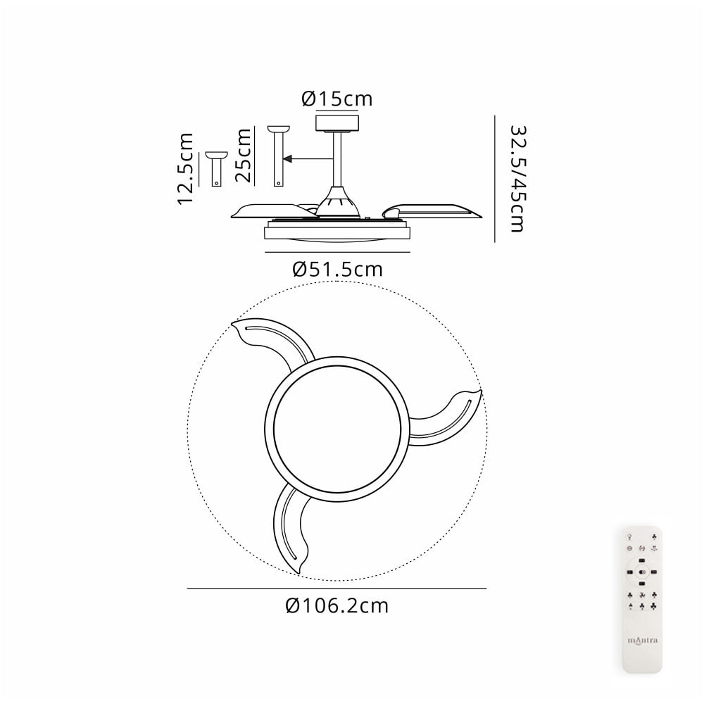 – doorsnede: Ø51,5-106 cm – hoogte: 32-44,5 cm – bevestiging: Ø15 cm – geïntegreerd LED – kleur: zwart – Kelvin: 3000-6500 + RGB – lumen: 5400 – dimbaar – inclusief afstandsbediening – minimaal 25 en maximaal 45 decibel – zomer + winter stand – geschikte ruimte: 13-20 m2