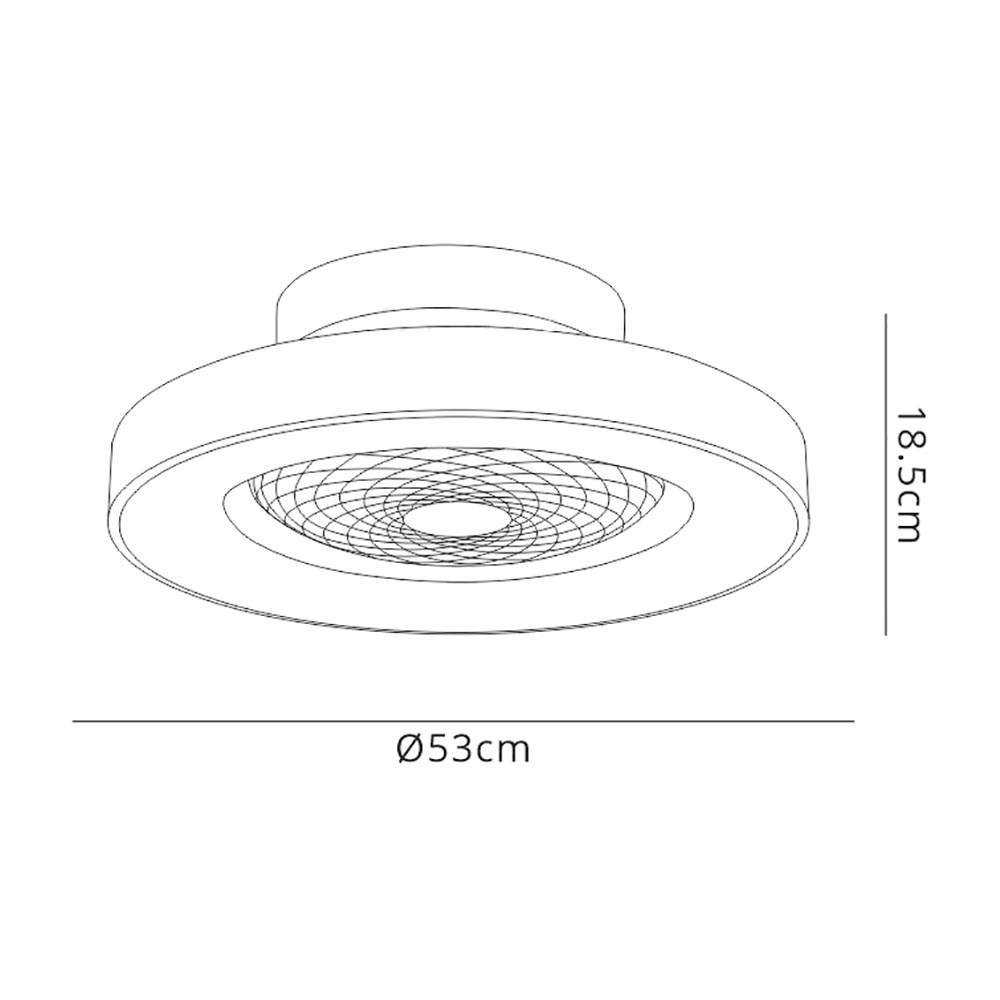 – afm: Ø53×18.5 cm – bevestiging: Ø28×5 cm – kap: Ø53×6 cm – bedienbaar met afstandsbediening – geïntegreerd LED – kleur: zwart / wit – Kelvin: 2700 – 5000 – lumen: 3000 – dimbaar – inclusief afstandsbediening – levensduur: 25.000 uur – gewicht: 6,4 kg – minimaal 32 en maximaal 54 decibel – 76m3 / min – zomer + winter stand – IP20 goedgekeurd – energieverbruik LED verlichting 70 watt – energieverbruik ventilator 33 watt