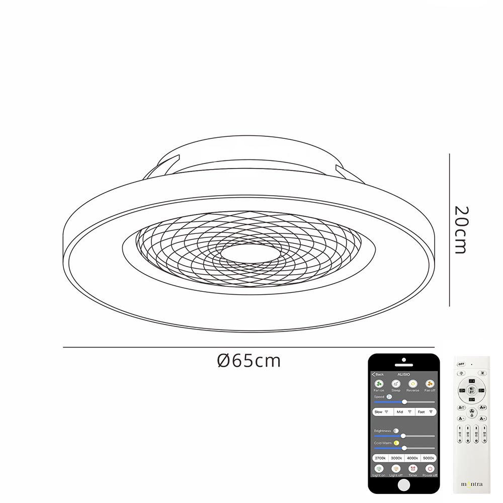 – afm: Ø65×20 cm – bevestiging: Ø35,5×5 cm – kap: Ø65×6 cm – ventilator: Ø38 cm – bedienbaar met afstandsbediening en app – geïntegreerd LED – kleur: wit – Kelvin: 2700 – 5000 – lumen: 3000 – dimbaar – inclusief afstandsbediening – mobiel bedienbaar via bluetooth/app – levensduur: 25.000 uur – gewicht: 6,4 kg – minimaal 41,8 en maximaal 51,8 decibel – 102m3 / min – zomer + winter stand – IP20 goedgekeurd – geschikte ruimte: 13-20 m2 – beschikt over voice control, werkt met Google assistant en Amazon Alexa – energieverbruik LED verlichting 70 watt – energieverbruik ventilator 35 watt – niet geschikt met een dimmer op de muur