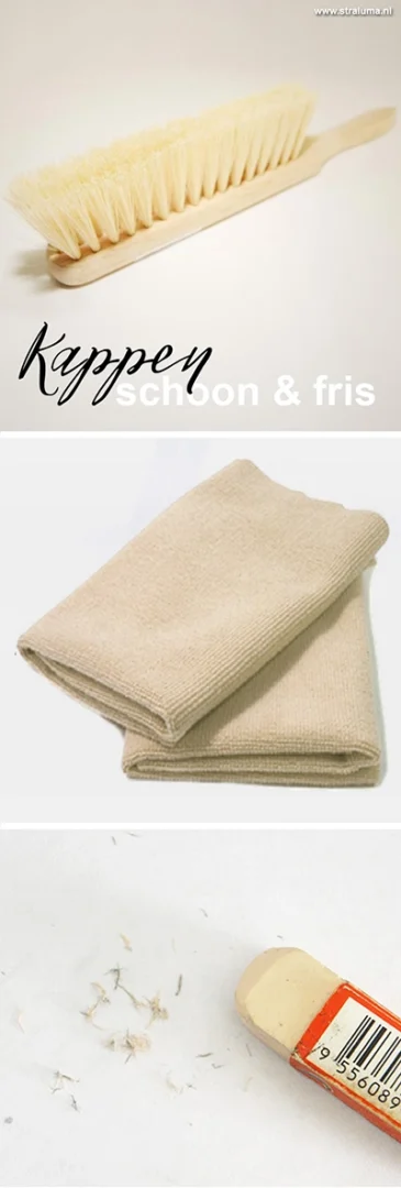 Een stoffen lampenkap, mag je nooit nat afnemen, dit kan vochtkringen veroorzaken. Stof haal je makkelijk van je kap met een kledingborstel. Het verwijderen van stof op de lampenkap gaat op dezelfde manier als het verwijderen van pluisjes en haren van je kleding. De lampenkap ziet er daarna weer als nieuw uit. De binnenkant van de lampenkap, meestal van kunststof, mag je met een iets vochtige zeem afnemen.De kleine zwarte puntjes (vliegenpoepjes) op een lampenkap haal je gemakkelijk weg met een gummetje. Gum rustig en met de vleug mee.