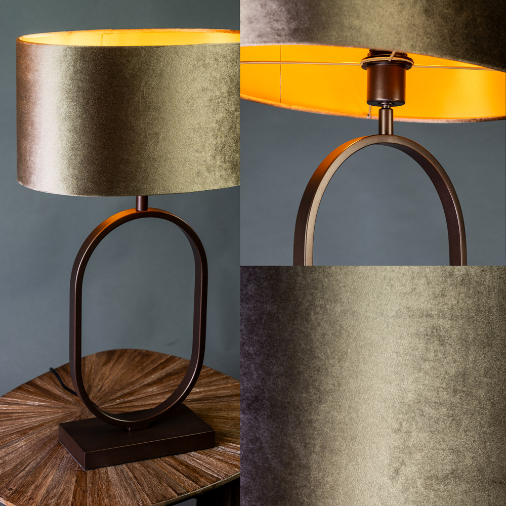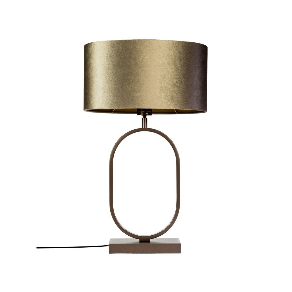 Belangrijkste kenmerken: • Kantelbaar lamphoofd: kap richtbaar naar alle zijden • Slank metalen frame in warme bruine tint • Goudkleurige ovale kap voor zacht, sfeervol licht • Compact formaat voor dressoir, nachtkastje of bijzettafel • E27-fitting: lichtbron eenvoudig te vervangen