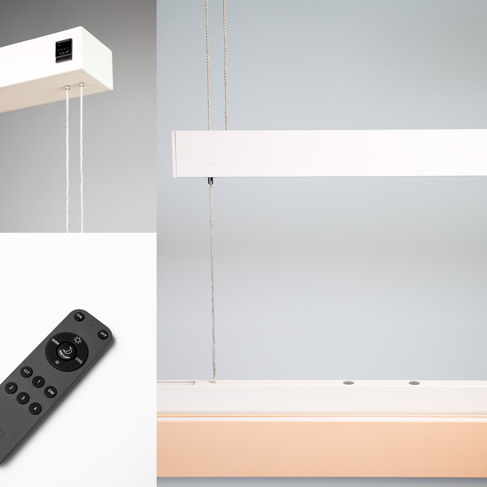 De Rivera hanglamp is ontworpen voor moderne interieurs die zowel sfeer als functionaliteit vragen. De combinatie van lichtgrijs met peach-accenten geeft de lamp een zachte, eigentijdse uitstraling. Dankzij het strakke lineaire ontwerp past hij perfect boven een eettafel of kookeiland — ideaal voor tafels van 140 tot 220 cm. Daarnaast is de lamp uitschuifbaar én gemakkelijk in hoogte verstelbaar dankzij het handige Lift-Me systeem. Zo pas je hem met één soepele beweging aan op elke situatie: van dineren tot werken.