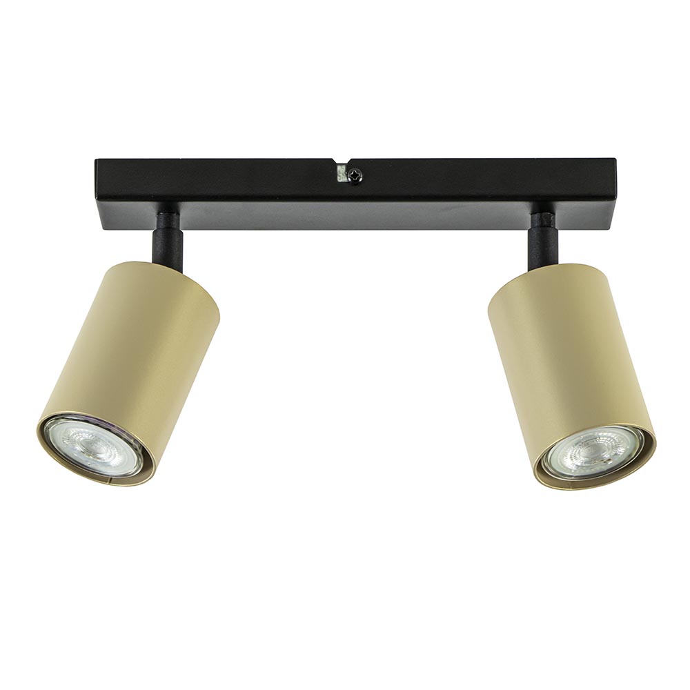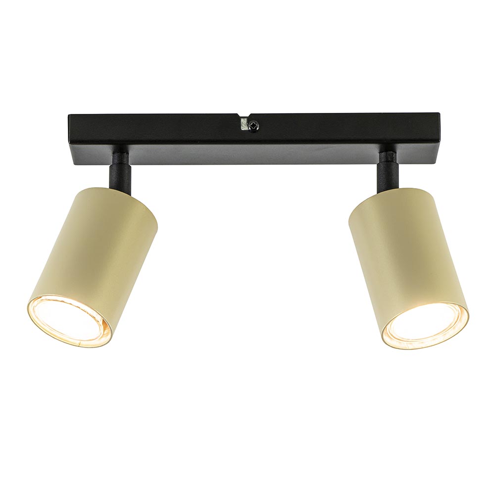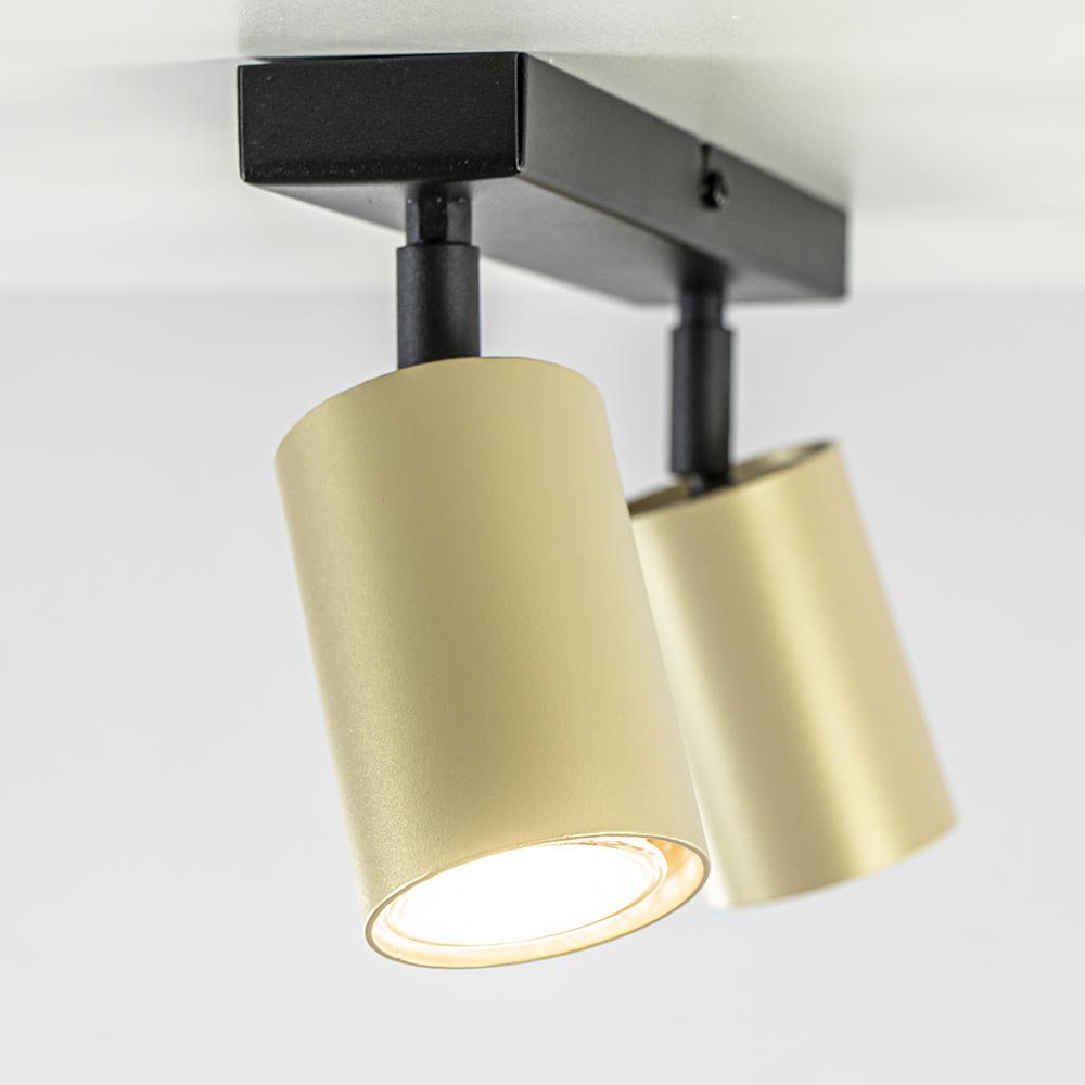 Prima geschikt voor een kleine kamer, hal of overloop. Deze 2-lichts opbouwspot zorgt voor genoeg licht een in wat kleinere ruimte. De plafondspot is gemaakt van metaal en uitgevoerd in het mat zwart met goud. De cilinder vormige spots zijn naar wens te verstellen door deze te draaien en/of kantelen. Ideaal om naar twee kanten te verlichten. De gouden spots zijn bevestigd op een kleine plafondbalk van 25 cm die in het mat zwart is afgewerkt. De 2-lichts opbouwspot is dimbaar dmv een externe dimmer (exclusief) en wordt geleverd zonder lichtbron (2x GU10).