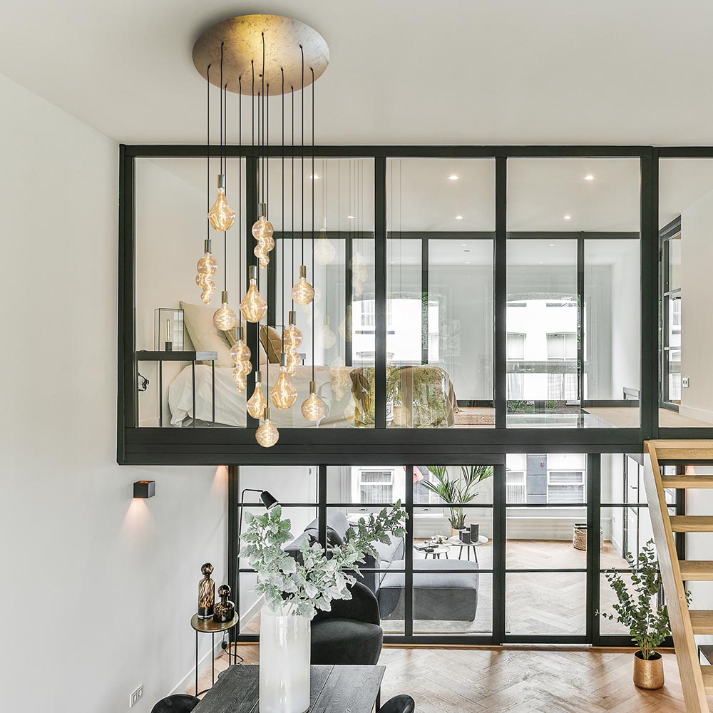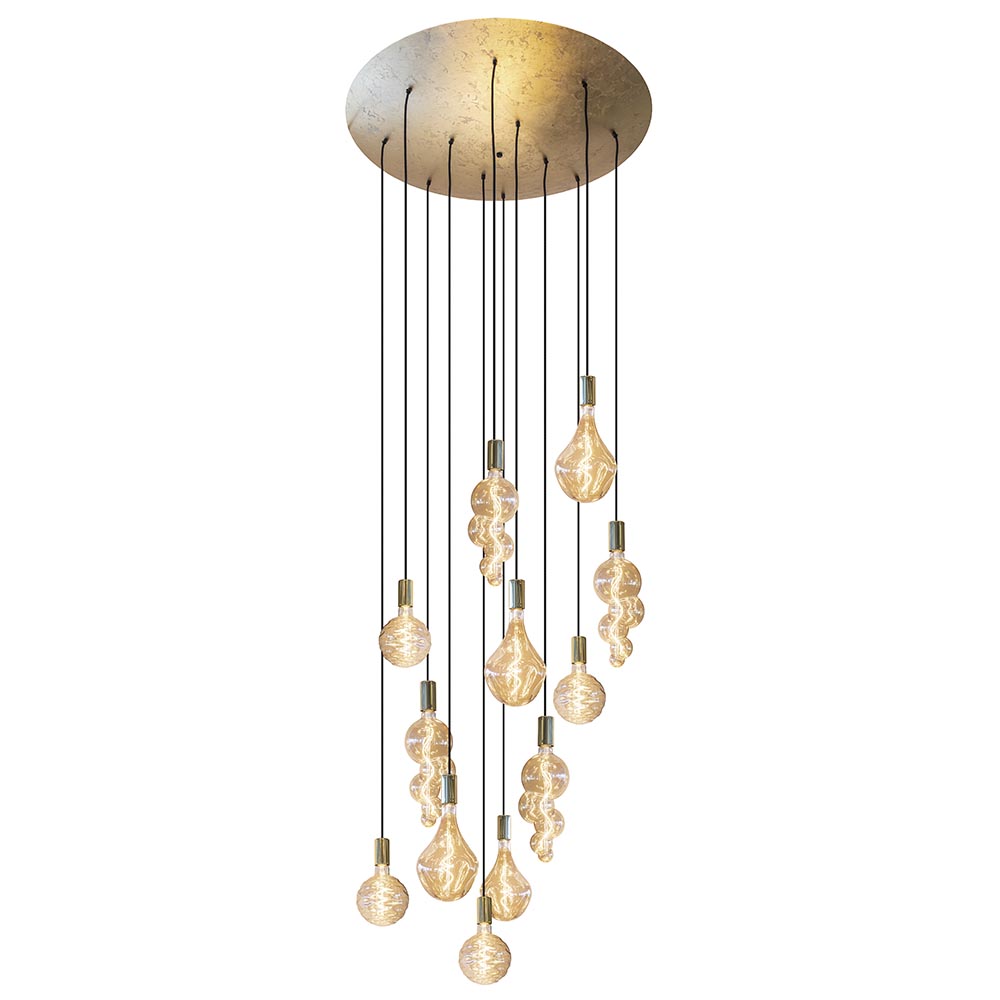 Wat een prachtig exemplaar. Deze grote hanglamp maakt het interieur helemaal af en is met recht een ware eyecatcher te noemen. De hanglamp heeft een maximale hoogte van 350 cm is daarmee prima toe te passen in een vide of een ruimte met een hoog plafond. Creëer een wauw effect met deze hanglamp in uw woning. De videlamp wordt aan het plafond bevestigd met een grote ronde plaat van 90 cm doorsnede. De plaat is gemaakt van metaal en uitgevoerd in het goldleaf. Over de plaat zijn 12 lichtpunten verdeeld die ieder zijn voorzien van zwarte stof omwonden snoeren. Aan de snoeren hangen de pendels met E27 fitting in de kleur shiny brass. U kunt de snoeren naar wens verdelen en de lamp zo helemaal eigen maken. Hang de lamp op klassieke wijze in spiraal vorm of juist moderner door alles speels door elkaar te hangen. Het totaalplaatje zal er in ieder geval altijd prachtig uitzien. De 12-lichts videlamp wordt geleverd exclusief lichtbronnen.