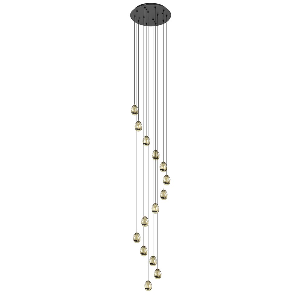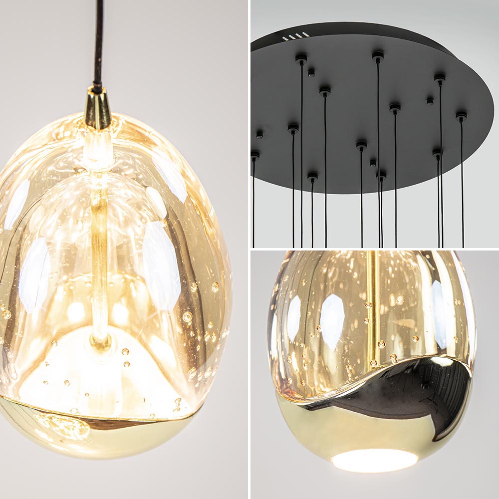 – hoogte: 350 cm – kappen: Ø9×12 cm – bevestiging: Ø47×4,5 cm (afwerkplaat: Ø50 cm) – metaal, mat zwart + goud – glas, amber – inclusief LED – 2700 Kelvin – 6300 lumen – in hoogte verstelbaar – dimbaar (exclusief) – gewicht: 16 kg